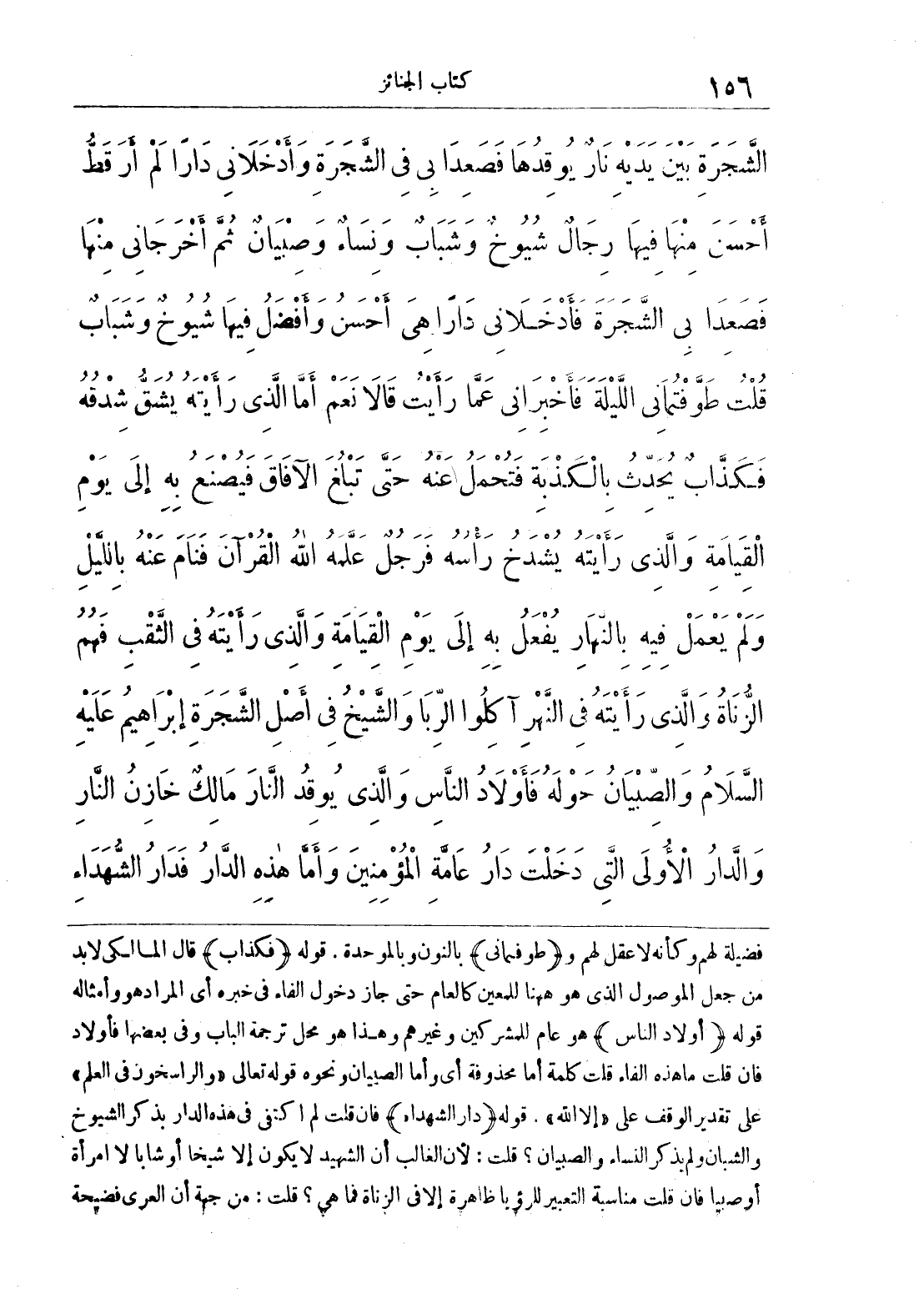 الشَّجَرَةِ بَيْنَ يَدَيْهِ نَارٌ يُوقِدُهَا، فَصَعِدَا بِى فِى الشَّجَرَةِ، وَأَدْخَلاَنِى دَاراً لَمْ أَرَ قَطُّ أَحْسَنَ مِنْهَا، فِيهَا رِجَالٌ شُيُوخٌ وَشَبَابٌ، وَنِسَاءٌ وَصِبْيَانٌ، ثُمَّ أَخْرَجَانِى مِنْهَا فَصَعِدَا بِى الشَّجَرَةَ فَأَدْخَلاَنِى دَاراً هِىَ أَحْسَنُ وَأَفْضَلُ، فِيهَا شُيُوخٌ وَشَبَابٌ. قُلْتُ طَوَّفْتُمَانِى اللَّيْلَةَ، فَأَخْبِرَانِى عَمَّا رَأَيْتُ. قَالاَ نَعَمْ، أَمَّا الَّذِى رَأَيْتَهُ يُشَقُّ شِدْقُهُ فَكَذَّابٌ يُحَدِّثُ بِالْكَذْبَةِ، فَتُحْمَلُ عَنْهُ حَتَّى تَبْلُغَ الآفَاقَ، فَيُصْنَعُ بِهِ إِلَى يَوْمِ الْقِيَامَةِ. وَالَّذِى رَأَيْتَهُ يُشْدَخُ رَاسُهُ فَرَجُلٌ عَلَّمَهُ اللَّهُ الْقُرْآنَ، فَنَامَ عَنْهُ بِاللَّيْلِ، وَلَمْ يَعْمَلْ فِيهِ بِالنَّهَارِ، يُفْعَلُ بِهِ إِلَى يَوْمِ الْقِيَامَةِ. وَالَّذِى رَأَيْتَهُ فِى الثَّقْبِ فَهُمُ الزُّنَاةُ. وَالَّذَى رَأَيْتَهُ فِى النَّهَرِ آكِلُو الرِّبَا. وَالشَّيْخُ فِى أَصْلِ الشَّجَرَةِ إِبْرَاهِيمُ - عَلَيْهِ السَّلاَمُ - وَالصِّبْيَانُ حَوْلَهُ فَأَوْلاَدُ النَّاسِ، وَالَّذِى يُوقِدُ النَّارَ مَالِكٌ خَازِنُ النَّارِ. وَالدَّارُ الأُولَى الَّتِى دَخَلْتَ دَارُ عَامَّةِ الْمُؤْمِنِينَ، وَأَمَّا هَذِهِ الدَّارُ فَدَارُ الشُّهَدَاءِ