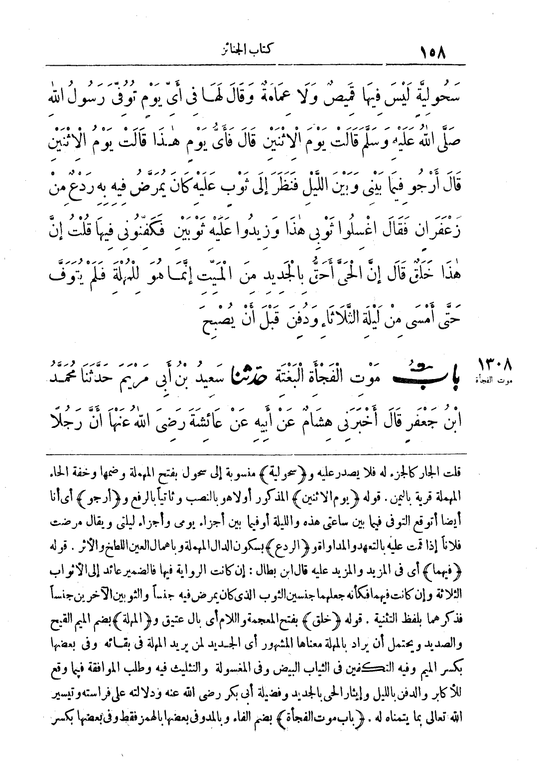 قلت الجار كالجزء له فلا يصدر عليه و (سحولية) منسوبة إلى سحول بفتح المهملة وضمها وخفة الحاء المهملة قرية باليمن. قوله (يوم الإثنين) المذكور أولاً هو بالنصب وثانياً بالرفع و (أرجو) أي أنا أيضاً أتوقع التوفي فيما بين ساعتي هذه والليلة أو فيما بين أجزاء يومي وأجزاء ليلتي ويقال مرضت فلاناً إذا قمت عليه بالتعهد والمداواة و (الردع) بسكون الدال المهملة وبإهمال العين اللطخ والأثر. قوله (فيهما) أي في المزيد والمزيد عليه قال ابن بطال: إن كانت الرواية فيها فالضمير عائد إلى الأثواب الثلاثة وإن كانت فيهما فكأنه جعلهما جنسين الثوب الذي كان يمرض فيه جنساً والثوبين الآخرين جنساً فذكرهما بلفظ التثنية. قوله (خلق) بفتح المعجمة واللام أي بال عتيق و (المهلة) بضم الميم القيح والصديد ويحتمل أن يراد بالمهلة معناها المشهور أي الجديد لمن يريد المهلة في بقائه وفي بعضها بكسر الميم وفيه التكفين في الثياب البيض وفي المغسولة والتثليث فيه وطلب الموافقة فيما وقع للأكابر والدفن بالليل وإيثار الحي بالجديد وفضيلة أبي بكر رضي الله عنه ودلالته على فراسته وتيسير الله تعالى بما يتمناه له. (باب موت الفجأة) بضم الفاء وبالمد وفي بعضها بالهمز فقط وفي بعضها بكسر