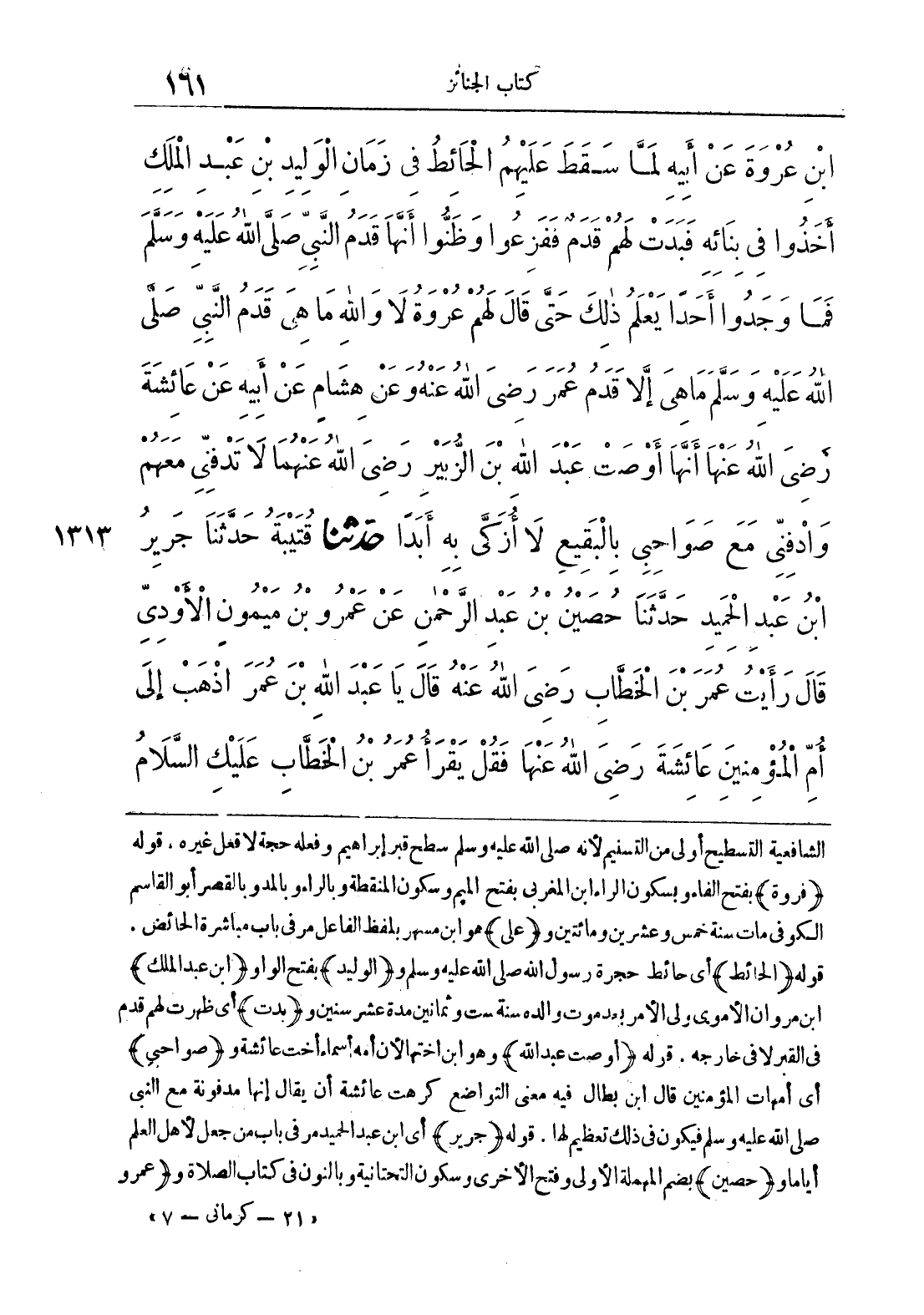 ابْنِ عُرْوَةَ عَنْ أَبِيهِ لَمَّا سَقَطَ عَلَيْهِمُ الْحَائِطُ فِى زَمَانِ الْوَلِيدِ بْنِ عَبْدِ الْمَلِكِ أَخَذُوا فِى بِنَائِهِ، فَبَدَتْ لَهُمْ قَدَمٌ فَفَزِعُوا، وَظَنُّوا أَنَّهَا قَدَمُ النَّبِىِّ صلى الله عليه وسلّم فَمَا وَجَدُوا أَحَداً يَعْلَمُ ذَلِكَ حَتَّى قَالَ لَهُمْ عُرْوَةُ لاَ وَاللَّهِ مَا هِىَ قَدَمُ النَّبِىِّ صلى الله عليه وسلّم مَا هِىَ إِلاَّ قَدَمُ عُمَرَ رضى الله عنه وَعَنْ هِشَامٍ عَنْ أَبِيهِ عَنْ عَائِشَةَ - رضى الله عنها - أَنَّهَا أَوْصَتْ عَبْدَ اللَّهِ بْنَ الزُّبَيْرِ - رضى الله عنهما - لاَ تَدْفِنِّى مَعَهُمْ وَادْفِنِّى مَعَ صَوَاحِبِى بِالْبَقِيعِ، لاَ أُزَكَّى بِهِ أَبَداً.