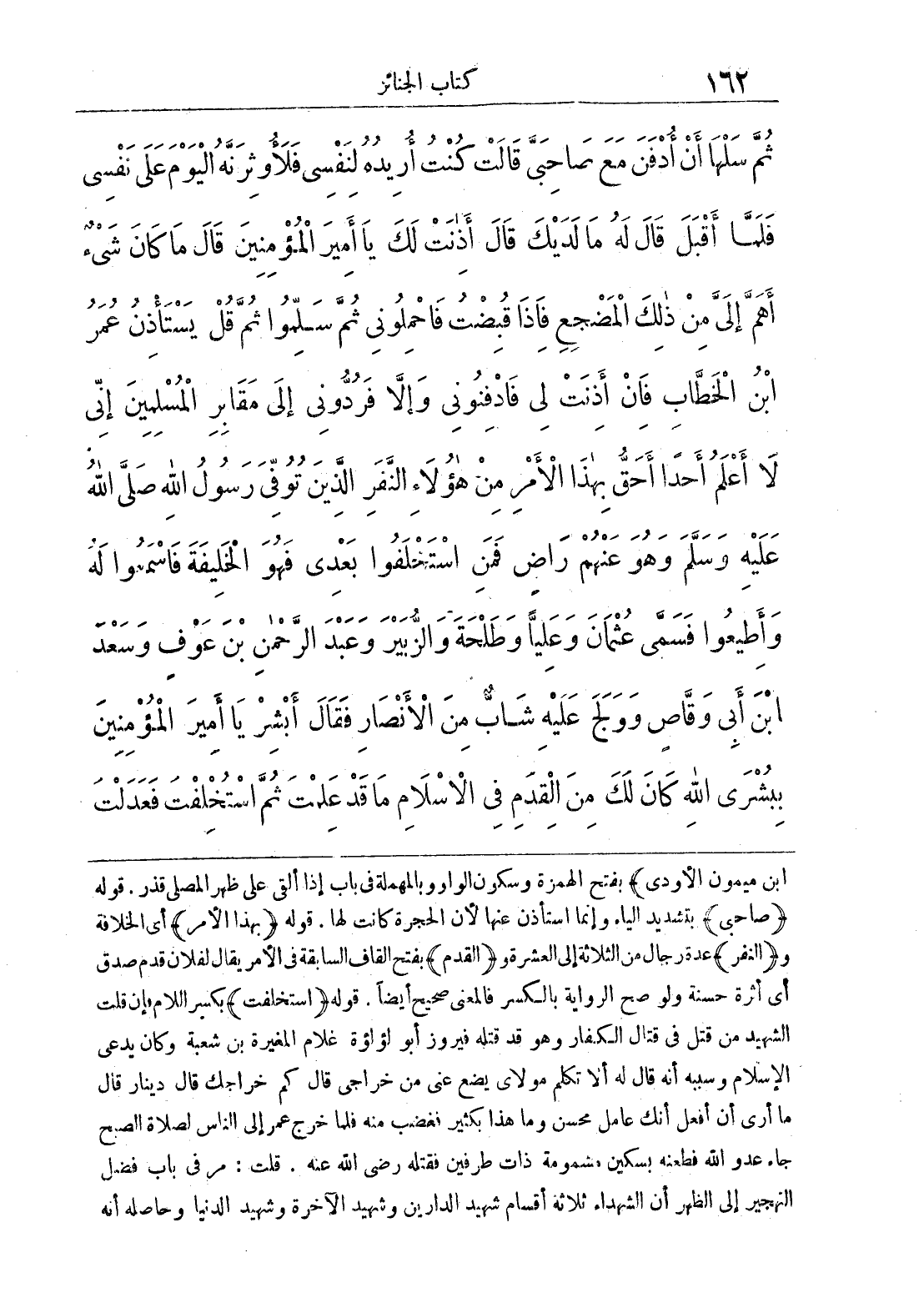 ثُمَّ سَلْهَا أَنْ أُدْفَنَ مَعَ صَاحِبَىَّ. قَالَتْ كُنْتُ أُرِيدُهُ لِنَفْسِى، فَلأُوثِرَنَّهُ الْيَوْمَ عَلَى نَفْسِى. فَلَمَّا أَقْبَلَ قَالَ لَهُ مَا لَدَيْكَ قَالَ أَذِنَتْ لَكَ يَا أَمِيرَ الْمُؤْمِنِينَ. قَالَ مَا كَانَ شَىْءٌ أَهَمَّ إِلَىَّ مِنْ ذَلِكَ الْمَضْجَعِ، فَإِذَا قُبِضْتُ فَاحْمِلُونِى ثُمَّ سَلِّمُوا ثُمَّ قُلْ يَسْتَاذِنُ عُمَرُ بْنُ الْخَطَّابِ. فَإِنْ أَذِنَتْ لِى فَادْفِنُونِى، وَإِلاَّ فَرُدُّونِى إِلَى مَقَابِرِ الْمُسْلِمِينَ، إِنِّى لاَ أَعْلَمُ أَحَداً أَحَقَّ بِهَذَا الأَمْرِ مِنْ هَؤُلاَءِ النَّفَرِ الَّذِينَ تُوُفِّىَ رَسُولُ اللَّهِ صلى الله عليه وسلّم وَهُوَ عَنْهُمْ رَاضٍ، فَمَنِ اسْتَخْلَفُوا بَعْدِى فَهُوَ الْخَلِيفَةُ، فَاسْمَعُوا لَهُ وَأَطِيعُوا. فَسَمَّى عُثْمَانَ وَعَلِيًّا وَطَلْحَةَ وَالزُّبَيْرَ وَعَبْدَ الرَّحْمَنِ بْنَ عَوْفٍ وَسَعْدَ بْنَ أَبِى وَقَّاصٍ، وَوَلَجَ عَلَيْهِ شَابٌّ مِنَ الأَنْصَارِ فَقَالَ أَبْشِرْ يَا أَمِيرَ الْمُؤْمِنِينَ بِبُشْرَى اللَّهِ، كَانَ لَكَ مِنَ الْقَدَمِ فِى الإِسْلاَمِ مَا قَدْ عَلِمْتَ، ثُمَّ اسْتُخْلِفْتَ فَعَدَلْتَ