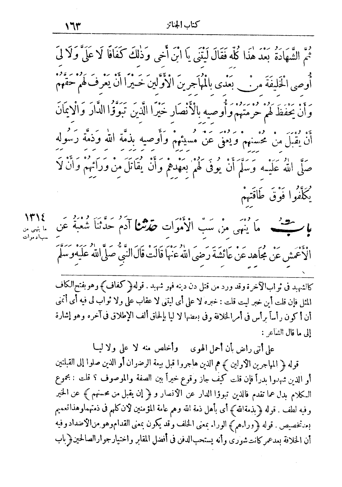 قوله (المهاجرين الأولين) هم الذين هاجروا قبل بيعة الرضوان أو الذين صلوا إلى القبلتين أو الذين شهدوا بدراً فإن قلت كيف جاز وقوع خيراً بين الصفة والموصوف؟ قلت: مجموع الكلام بدل عما تقدم فالذين تبوءوا الدار عن الأنصار و (ن يقبل من محسنهم) عن الخير وفيه لطف. قوله (بذمة الله) أي بأهل ذمة الله وهم عامة المؤمنين لأن كلهم في ذمتهما وهذا تعميم بعد تخصيص. قوله (وراءهم) الوراء بمعنى الخلف وقد يكون بمعنى القدام وهو من الأضداد وفيه أن الخلافة بعد عمر كانت شورى وأنه يستحب الدفن في أفضل المقابر واختيار جوار الصالحين (باب