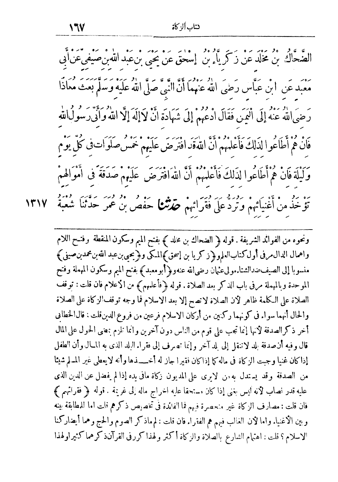 ونحوه من الفوائد الشريفة. قوله (الضحاك بن مخلد) بفتح الميم وسكون المنقطة وفتح اللام وإهمال الدال مر في أول كتاب العلم و (زكريا بن إسحق) المكي و (يحيى بن عبد الله بن محمد بن صيفي) منسوباً إلى الصيف ضد الشتاء مولى عثمان رضي الله عنه و (أبو معبد) بفتح الميم وسكون المهملة وفتح الموحدة وبالمهملة مر في باب الذكر بعد الصلاة. قوله (فأعلمهم) من الأعلام فإن قلت: توقف الصلاة على الكلمة ظاهر لأن الصلاة لا تصح إلا بعد الإسلام فما وجه توقف الزكاة على الصلاة والحال أنهما سواء في كونهما ركنين من أركان الإسلام فرعين من فروع الدين قلت: قال الخطابي أخر ذكر الصدقة لأنها إنما تجب على قوم من الناس دون آخرين وإنما تلزم بمضي الحول على المال قال وفيه أن صدقة بلد لا تنقل إلى بلد آخر وإنما تصرف إلى فقراء البلد الذي به المال وأن للطفل إذا كان غنياً وجبت الزكاة في ماله كما إذا كان فقيراً جاز له أخذها وأنه لا يعطي غير المسلم شيئاً من الصدقة وقد يستدل به من لا يرى على المديون زكاة ما في يده إذا لم يفضل عن الدين الذي عليه قدر نصاب لأنه ليس بغني إذا كان مستحقاً عليه إخراج ماله إلى غريمه. قوله (فقرائهم) فإن قلت: مصارف الزكاة غير منحصرة فيهم فما الفائدة في تخصيص ذكرهم قلت أما للمطابقة بينه وبين الأغنياء وأما لأن الغالب فيهم هم الفقراء فإن قلت: لم ما ذكر الصوم والحج وهما أيضاً ركنا الإسلام؟ قلت: اهتمام الشارع بالصلاة والزكاة أكثر ولهذا كرر في القرآن ذكرهما كثيراً ولهذا