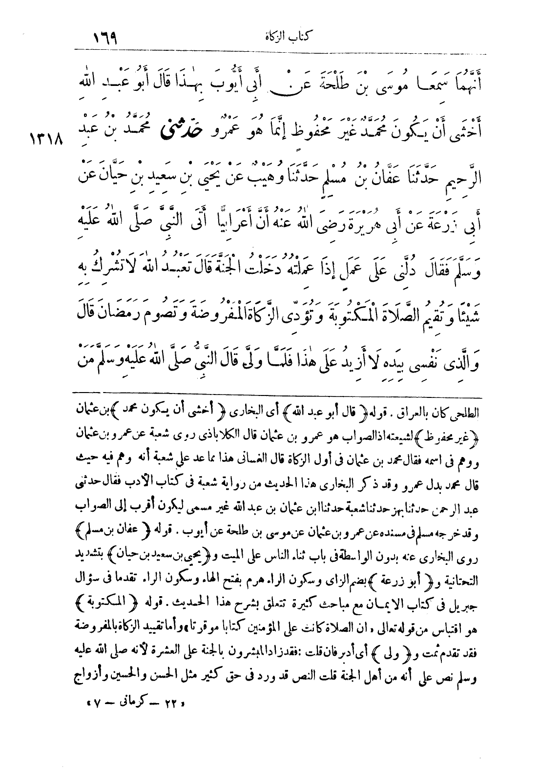 1318 - حَدَّثَنِى مُحَمَّدُ بْنُ عَبْدِ الرَّحِيمِ حَدَّثَنَا عَفَّانُ بْنُ مُسْلِمٍ حَدَّثَنَا وُهَيْبٌ عَنْ يَحْيَى بْنِ سَعِيدِ بْنِ حَيَّانَ عَنْ أَبِى زُرْعَةَ عَنْ أَبِى هُرَيْرَةَ - رضى الله عنه - أَنَّ أَعْرَابِيًّا أَتَى النَّبِىَّ صلى الله عليه وسلّم فَقَالَ دُلَّنِى عَلَى عَمَلٍ إِذَا عَمِلْتُهُ دَخَلْتُ الْجَنَّةَ. قَالَ «تَعْبُدُ اللَّهَ لاَ تُشْرِكُ بِهِ شَيْئاً، وَتُقِيمُ الصَّلاَةَ الْمَكْتُوبَةَ، وَتُؤَدِّى الزَّكَاةَ الْمَفْرُوضَةَ، وَتَصُومُ رَمَضَانَ». قَالَ وَالَّذِى نَفْسِى بِيَدِهِ لاَ أَزِيدُ عَلَى هَذَا. فَلَمَّا وَلَّى قَالَ النَّبِىُّ صلى الله عليه وسلّم «مَنْ