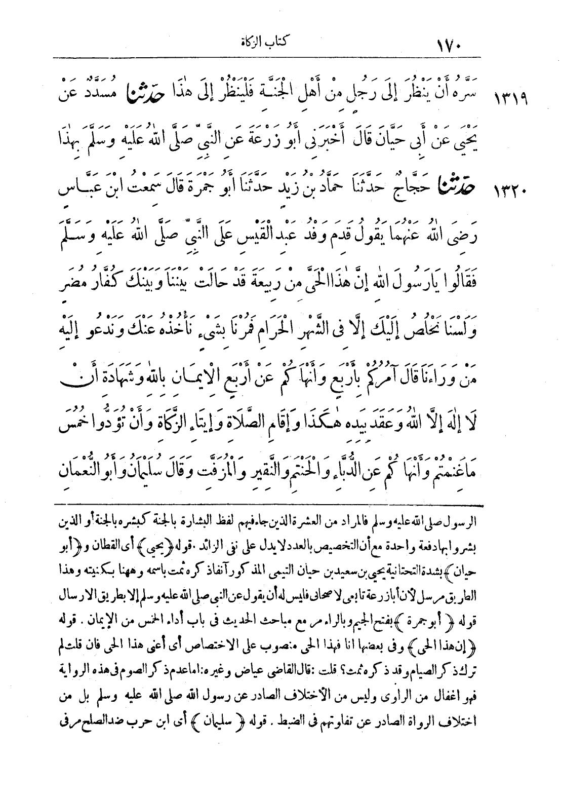 1320 - حَدَّثَنَا حَجَّاجٌ حَدَّثَنَا حَمَّادُ بْنُ زَيْدٍ حَدَّثَنَا أَبُو جَمْرَةَ قَالَ سَمِعْتُ ابْنَ عَبَّاسٍ رضى الله عنهما يَقُولُ قَدِمَ وَفْدُ عَبْدِ الْقَيْسِ عَلَى النَّبِىِّ صلى الله عليه وسلّم فَقَالُوا يَا رَسُولَ اللَّهِ إِنَّ هَذَا الْحَىَّ مِنْ رَبِيعَةَ قَدْ حَالَتْ بَيْنَنَا وَبَيْنَكَ كُفَّارُ مُضَرَ، وَلَسْنَا نَخْلُصُ إِلَيْكَ إِلاَّ فِى الشَّهْرِ الْحَرَامِ، فَمُرْنَا بِشَىْءٍ نَاخُذُهُ عَنْكَ، وَنَدْعُو إِلَيْهِ مَنْ وَرَاءَنَا. قَالَ «آمُرُكُمْ بِأَرْبَعٍ، وَأَنْهَاكُمْ عَنْ أَرْبَعٍ الإِيمَانِ بِاللَّهِ وَشَهَادَةِ أَنْ لاَ إِلَهَ إِلاَّ اللَّهُ وَعَقَدَ بِيَدِهِ هَكَذَا وَإِقَامِ الصَّلاَةِ، وَإِيتَاءِ الزَّكَاةِ، وَأَنْ تُؤَدُّوا خُمُسَ مَا غَنِمْتُمْ، وَأَنْهَاكُمْ عَنِ الدُّبَّاءِ وَالْحَنْتَمِ وَالنَّقِيرِ وَالْمُزَفَّتِ». وَقَالَ سُلَيْمَانُ وَأَبُو النُّعْمَانِ