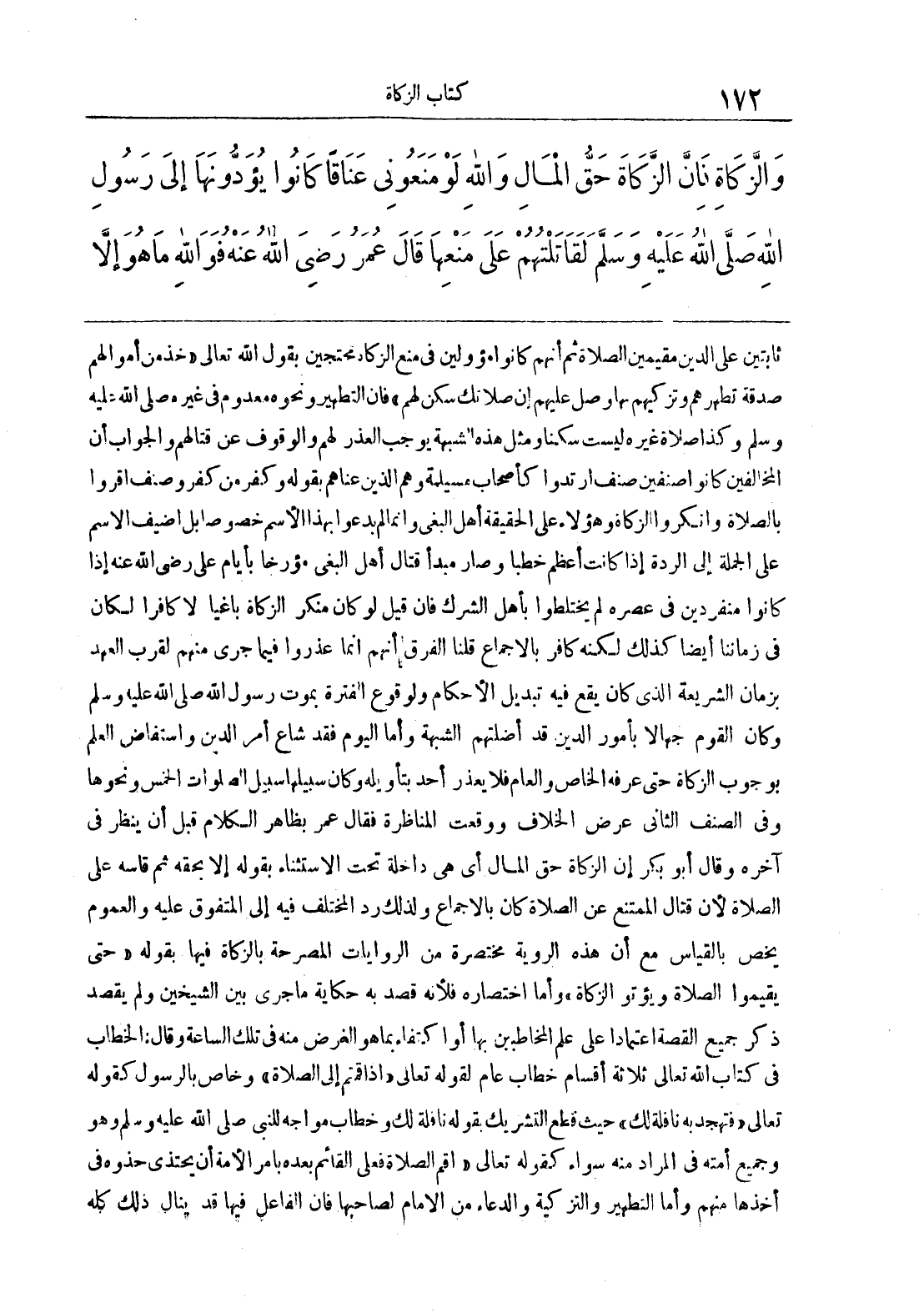 ثابتين على الدين مقيمين الصلاة ثم أنهم كانوا مؤولين في منع الزكاة محتجين بقول الله تعالى (خذ من أموالهم صدقة تطهرهم وتزكيهم بها وصل عليهم إن صلاتك سكن لهم) فإن التطهير ونحوه معدوم في غيره صلى الله عليه وسلّم وكذا صلاة غيره ليست سكناً ومثل هذه الشبهة يوجب العذر لهم والوقوف عن قتالهم والجواب أن المخالفين كانوا صنفين صنف ارتدوا كأصحاب مسيلمة وهم الذين عناهم بقوله وكفر من كفر وصنف أقروا بالصلاة وأنكروا الزكاة وهؤلاء على الحقيقة أهل البغي وإنما لم يدعوا بهذا الاسم خصوصاً بل أضيف الاسم على الجملة إلى الردة إذا كانت أعظم خطباً وصار مبدأ قتال أهل البغي مؤرخاً بأيام علي رضي الله عنه إذا كانوا منفردين في عصره لم يختلطوا بأهل الشرك فإن قيل لو كان منكر الزكاة باغياً لا كافراً لكان في زماننا أيضاً كذلك لكن كافر بالإجماع قلنا الفرق أنهم إنما عذروا فيما جرى منهم لقرب العهد بزمان الشريعة الذي كان يقع فيه تبديل الأحكام ولوقوع الفترة بموت رسول الله صلى الله عليه وسلّم وكان القوم جهالاً بأمور الدين قد أضلتهم الشبهة وأما اليوم فقد شاع أمر الدين واستفاض العلم بوجوب الزكاة حتى عرفه الخاص والعام فلا يعذر أحد بتأويله وكان سبيلها سبيل الصلوات الخمس ونحوها فوفي الصنف الثاني عرض الخلاف ووقعت المناظرة فقال عمر بظاهر الكلام قبل أن ينظر في آخره وقال أبو بكر إن الزكاة حق المال أي هي داخلة تحت الاستثناء بقوله إلا بحقه ثم قاسه على الصلاة لأن قتال الممتنع عن الصلاة كان بالإجماع ولذلك رد المختلف فيه إلى المتفوق عليه والعموم يخص بالقياس مع أن هذه الروية مختصرة من الروايات المصرحة بالزكاة فيها بقوله (حتى يقيموا الصلاة ويؤتوا الزكاة) وأما اختصاره فلأنه قصد به حكاية ما جرى بين الشيخين ولم يقصد ذكر جميع القصة اعتماداً على علم المخاطبين بها أو اكتفاء بما هو الغرض منه في تلك الساعة وقال: الخطاب في كتاب الله تعالى ثلاثة أقاسم خطاب عام لقوله تعالى (إذا قمتم إلى الصلاة) وخاص بالرسول كقوله تعالى (فتهجد به نافلة لك) حيث قطع التشريك بقول نافلة لك وخاطب مواجه للنبي صلى الله عليه وسلّم وهو وجميع أمته في المراد منه سواء كقوله تعالى (أقم الصلاة فعلى القائم بعده بأمر الأمة أن يحتذى حذوه في أخذها منهم وأما التطهير والتزكية والدعاء من الإمام لصاحبها فإن الفاعل فيها قد ينال ذلك كله