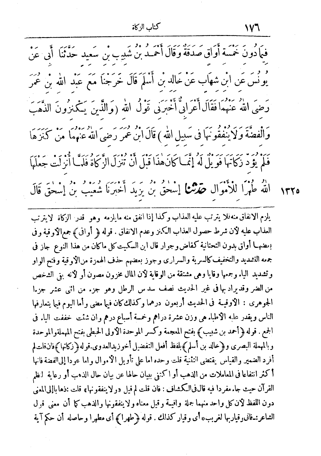 يلزم الإنفاق منه فلا يترتب عليه العذاب وكذا إذا أنفق منه ما يلزمه وهو قدر الزكاة لا يترتب العذاب عليه لأن شرط حصول العذاب الكنز وعدم الإنفاق. قوله (أواقي) جمع الأوقية وفي بعضها أواق بدون التحتانية كقاض وجواز قال ابن السكيت كل ما كان من هذا النوع جاز في جمعه التشديد والتخفيف كالسرية والسراري وجوز بعضهم حذف الهمزة من الأوقية وفتح الواو وتشديد الياء وجمعها وقايا وهي مشتقة من الوقاية لأن المال مخزون مصون أو لأنه بقى الشخص من الضر وقد يراد بها في غير الحديث نصف سدس الرطل وهو جزء من اثني عشر جزءاً الجوهري: الأوقية في الحديث أربعون درهماً وكذلك كان فيما مضى وأما اليوم فيما يتعارفها الناس ويقدر عليه الأطباء هي وزن عشرة دراهم وخمسة أسباع درهم وإن شئت خفت الياء في الجمع. قوله (أحمد بن شبيب) بفتح المعجمة وكسر الموحدة الأولى الحبطى بفتح المهملة والموحدة وبالمهملة البصري و (خالد بن أسلم) بلفظ أفعل التفضيل أخو زيد العدوي. قوله (زكاتها) فإن قلت لم أفرد الضمير والقياس يقتضي التثنية قلت وحده أما على تأويل الأموال وأما عوداً إلى الفضة فإنها أكثر انتفاعاً في المعاملات من الذهب أو اكتفى ببيان حالها عن بيان حال الذهب أو رعاية لنظم القرآن حيث جاء مفرداً فيه قال في الكشاف: فإن قلت لم قيل (ولا ينفقونها) قلت: ذهاباً إلى المعنى دون اللفظ لأن كل واحد منهما جملة وافية وقيل معناه ولا ينفقونها والذهب كما أن معنى قول الشاعر: فإني وقيار بها لغريب* أي وقيار كذلك. قوله (طهرا) أي مطهرا وحاصله أن حكم آية