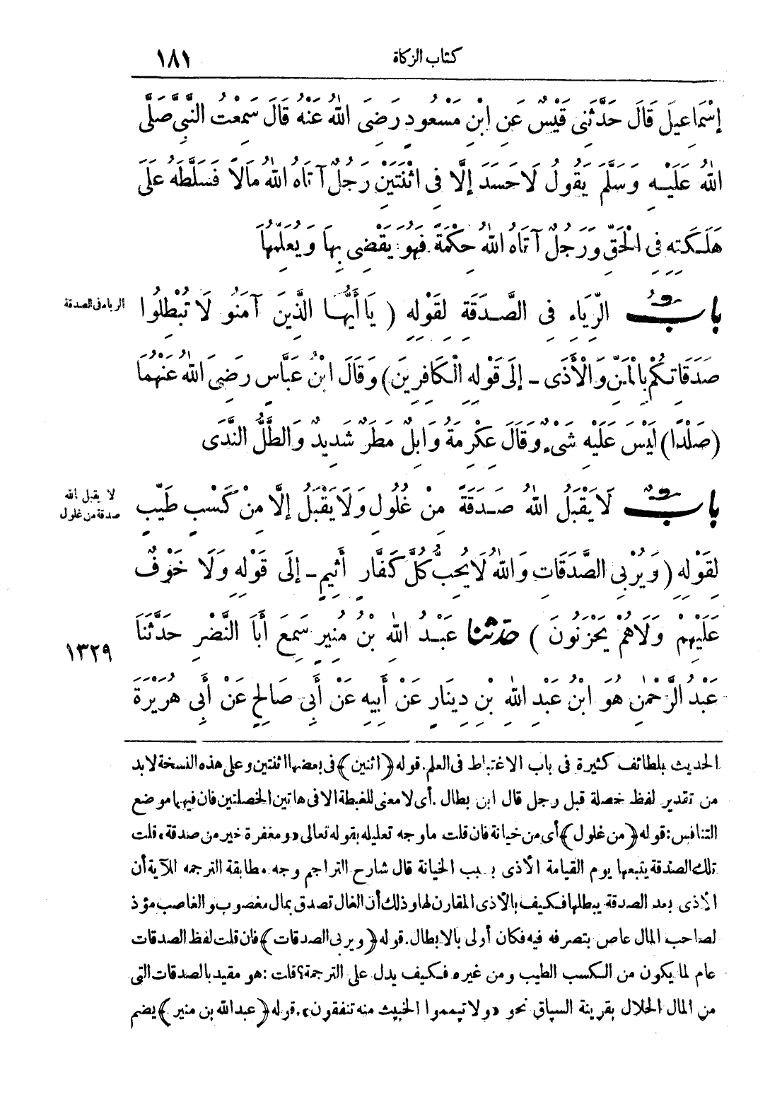 الحديث بلطائف كثيرة في باب الاغتباط في العلم. قوله (اثنين) في بعضها اثنتين وعلى هذه النسخة لابد من تقدير لفظ خصلة قبل رجل قال ابن بطال. أي لا معنى للغبطة إلا في هاتين الخصلتين فإن فيهما موضع التنافس: قوله (من غلول) أي من خيانة فإن قلت ما وجه تعليله بقوله تعالى (ومغفرة خير من صدقة) قلت تلك الصدقة يتبعها يوم القيامة الأذى بسبب الخيانة قال شارح التراجم وجه مطابقة الترجمة للآية أن الأذى بعد الصدقة يبطلها فكيف بالأذى المقارن لها وذلك أن الغال تصدق بمال مغصوب والغاصب مؤذ لصاحب المال عاص بتصرفه فيه فكان أولى بالإبطال. قوله (ويربي الصدقات) فإن قلت لفظ الصدقات عام لما يكون من الكسب الطيب ومن غيره فكيف يدل على الترجمة؟ قلت: هو مقيد الصدقات التي من المال الحلال بقرينة السباق نحو (ولا تيمموا الخبيث منه تنفقون). قوله (عبد الله بن منير) يضم