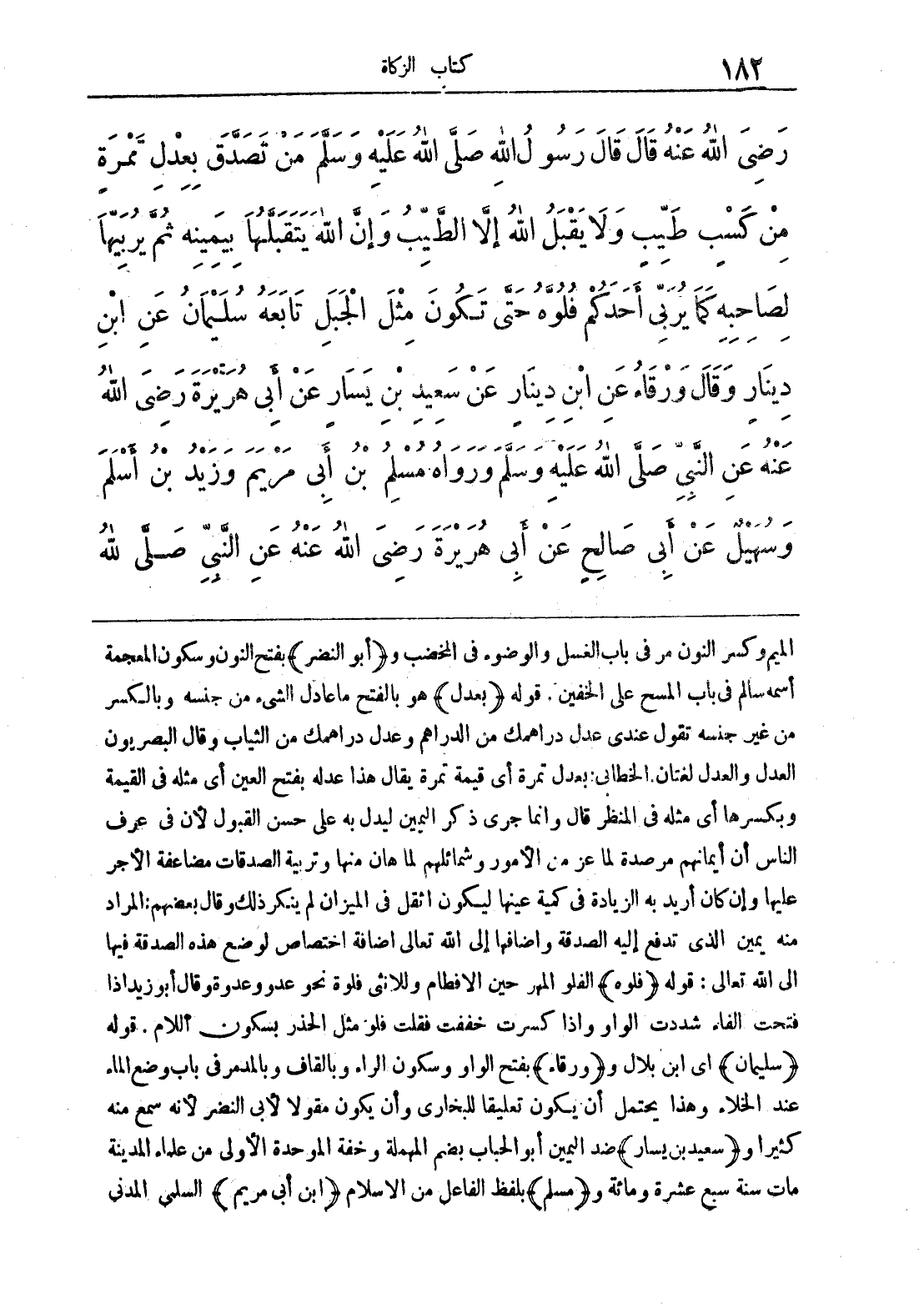 رضى الله عنه قَالَ قَالَ رَسُولُ اللَّهِ صلى الله عليه وسلّم «مَنْ تَصَدَّقَ بِعَدْلِ تَمْرَةٍ مِنْ كَسْبٍ طَيِّبٍ - وَلاَ يَقْبَلُ اللَّهُ إِلاَّ الطَّيِّبَ - وَإِنَّ اللَّهَ يَتَقَبَّلُهَا بِيَمِينِهِ، ثُمَّ يُرَبِّيهَا لِصَاحِبِهِ كَمَا يُرَبِّى أَحَدُكُمْ فَلْوَهُ حَتَّى تَكُونَ مِثْلَ الْجَبَلِ». تَابَعَهُ سُلَيْمَانُ عَنِ ابْنِ دِينَارٍ وَقَالَ وَرْقَاءُ عَنِ ابْنِ دِينَارٍ عَنْ سَعِيدِ بْنِ يَسَارٍ عَنْ أَبِى هُرَيْرَةَ - رضى الله عنه - عَنِ النَّبِىِّ صلى الله عليه وسلّم. وَرَوَاهُ مُسْلِمُ بْنُ أَبِى مَرْيَمَ وَزَيْدُ بْنُ أَسْلَمَ وَسُهَيْلٌ عَنْ أَبِى صَالِحٍ عَنْ أَبِى هُرَيْرَةَ رضى الله عنه عَنِ النَّبِىِّ صلى الله
