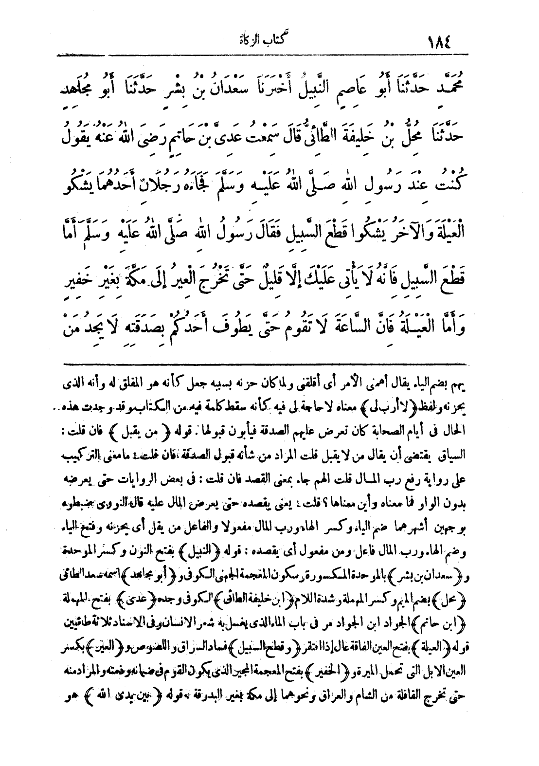 مُحَمَّدٍ حَدَّثَنَا أَبُو عَاصِمٍ النَّبِيلُ أَخْبَرَنَا سَعْدَانُ بْنُ بِشْرٍ حَدَّثَنَا أَبُو مُجَاهِدٍ حَدَّثَنَا مُحِلُّ بْنُ خَلِيفَةَ الطَّائِىُّ قَالَ سَمِعْتُ عَدِىَّ بْنَ حَاتِمٍ - رضى الله عنه - يَقُولُ كُنْتُ عِنْدَ رَسُولِ اللَّهِ صلى الله عليه وسلّم فَجَاءَهُ رَجُلاَنِ أَحَدُهُمَا يَشْكُو الْعَيْلَةَ، وَالآخَرُ يَشْكُو قَطْعَ السَّبِيلِ، فَقَالَ رَسُولُ اللَّهِ صلى الله عليه وسلّم «أَمَّا قَطْعُ السَّبِيلِ فَإِنَّهُ لاَ يَاتِى عَلَيْكَ إِلاَّ قَلِيلٌ حَتَّى تَخْرُجَ الْعِيرُ إِلَى مَكَّةَ بِغَيْرِ خَفِيرٍ، وَأَمَّا الْعَيْلَةُ فَإِنَّ السَّاعَةَ لاَ تَقُومُ حَتَّى يَطُوفَ أَحَدُكُمْ بِصَدَقَتِهِ لاَ يَجِدُ مَنْ