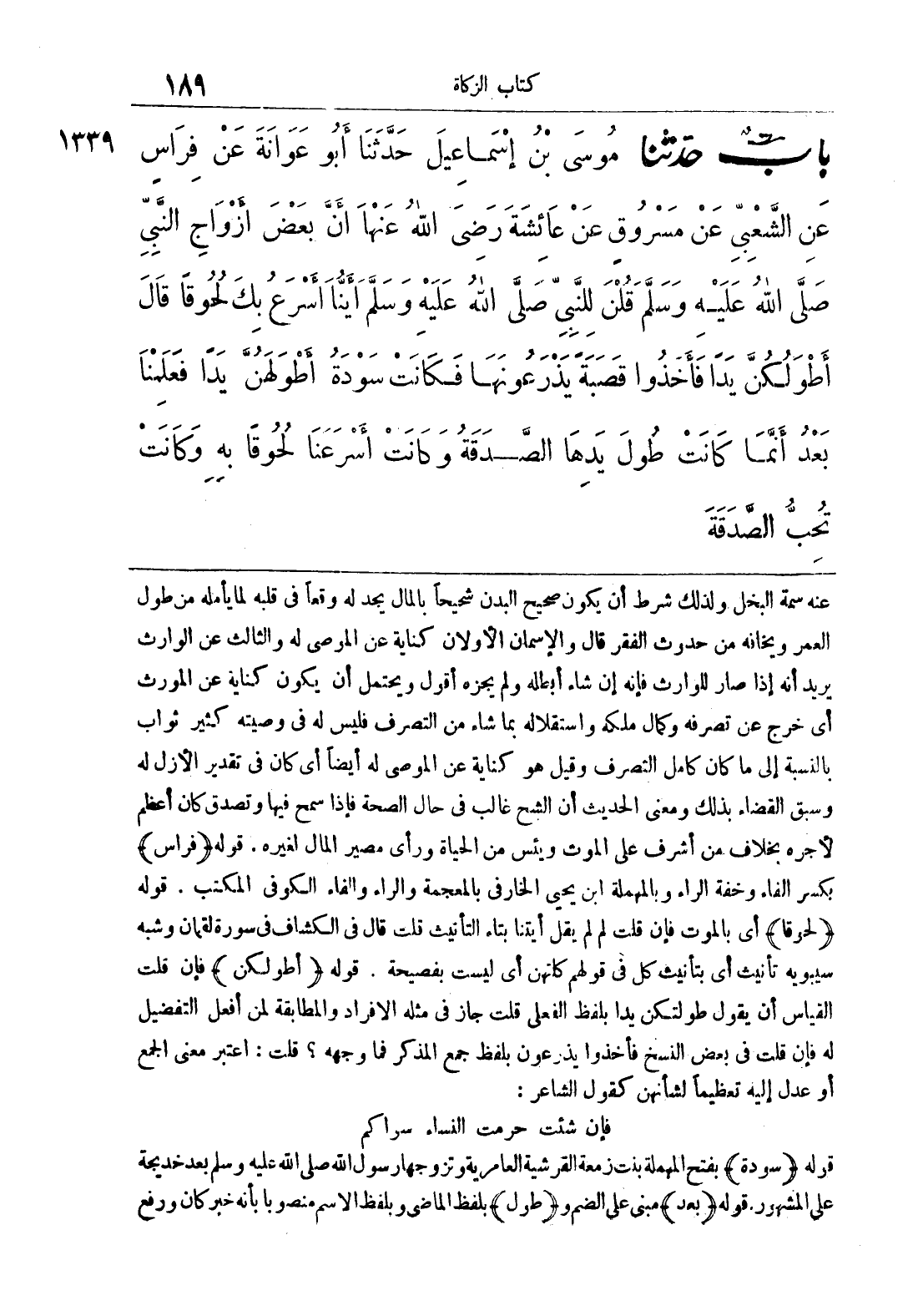 1339 - حَدَّثَنَا مُوسَى بْنُ إِسْمَاعِيلَ حَدَّثَنَا أَبُو عَوَانَةَ عَنْ فِرَاسٍ عَنِ الشَّعْبِىِّ عَنْ مَسْرُوقٍ عَنْ عَائِشَةَ رضى الله عنها أَنَّ بَعْضَ أَزْوَاجِ النَّبِىِّ صلى الله عليه وسلّم قُلْنَ لِلنَّبِىِّ صلى الله عليه وسلّم أَيُّنَا أَسْرَعُ بِكَ لُحُوقاً قَالَ «أَطْوَلُكُنَّ يَداً». فَأَخَذُوا قَصَبَةً يَذْرَعُونَهَا، فَكَانَتْ سَوْدَةُ أَطْوَلَهُنَّ يَداً، فَعَلِمْنَا بَعْدُ أَنَّمَا كَانَتْ طُولَ يَدِهَا الصَّدَقَةُ، وَكَانَتْ أَسْرَعَنَا لُحُوقاً بِهِ وَكَانَتْ تُحِبُّ الصَّدَقَةَ.
