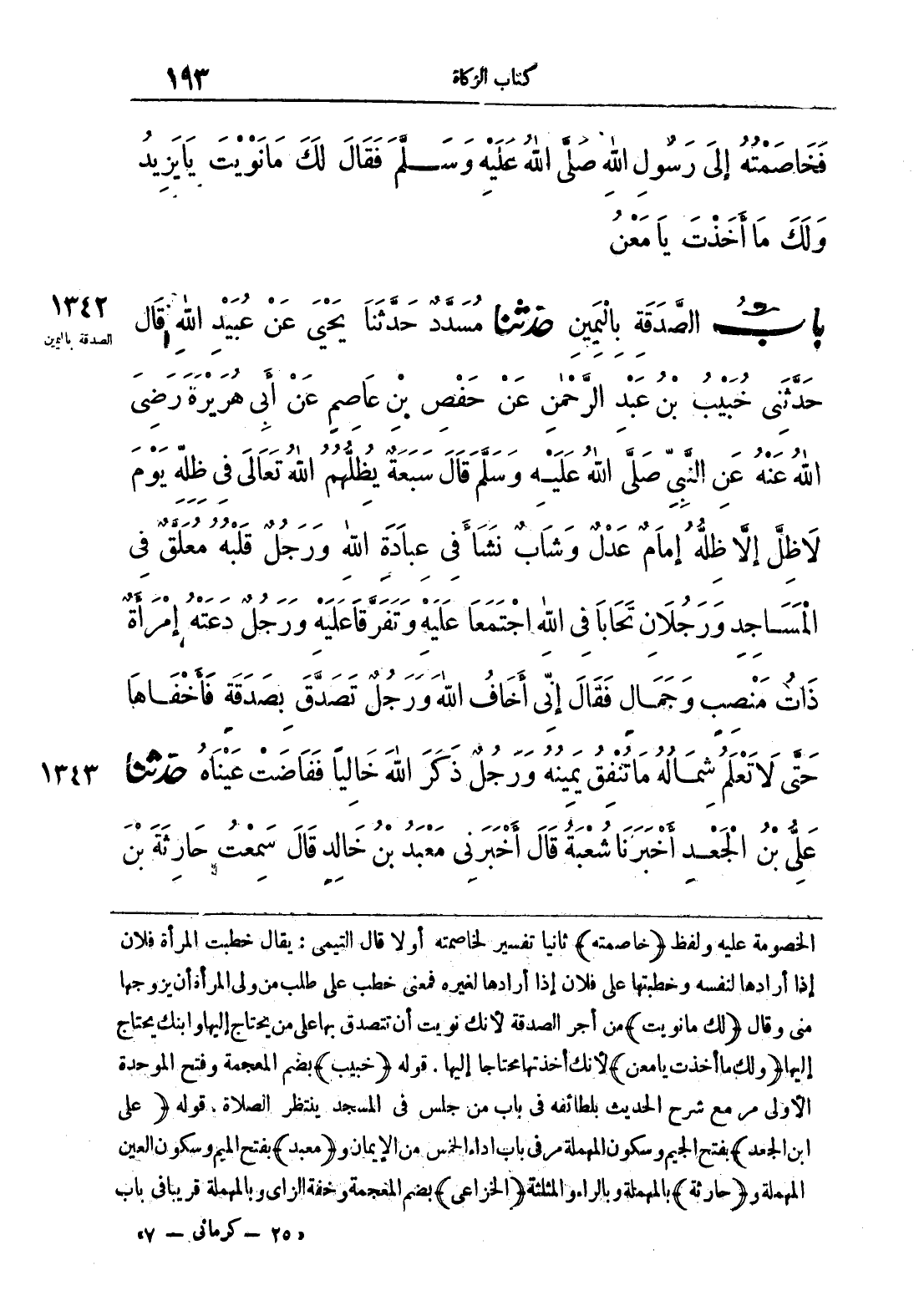 1342 - حَدَّثَنَا مُسَدَّدٌ حَدَّثَنَا يَحْيَى عَنْ عُبَيْدِ اللَّهِ قَالَ حَدَّثَنِى خُبَيْبُ بْنُ عَبْدِ الرَّحْمَنِ عَنْ حَفْصِ بْنِ عَاصِمٍ عَنْ أَبِى هُرَيْرَةَ رضى الله عنه عَنِ النَّبِىِّ صلى الله عليه وسلّم قَالَ «سَبْعَةٌ يُظِلُّهُمُ اللَّهُ تَعَالَى فِى ظِلِّهِ يَوْمَ لاَ ظِلَّ إِلاَّ ظِلُّهُ إِمَامٌ عَدْلٌ، وَشَابٌّ نَشَأَ فِى عِبَادَةِ اللَّهِ، وَرَجُلٌ قَلْبُهُ مُعَلَّقٌ فِى الْمَسَاجِدِ، وَرَجُلاَنِ تَحَابَّا فِى اللَّهِ اجْتَمَعَا عَلَيْهِ وَتَفَرَّقَا عَلَيْهِ، وَرَجُلٌ دَعَتْهُ امْرَأَةٌ ذَاتُ مَنْصِبٍ وَجَمَالٍ فَقَالَ إِنِّى أَخَافُ اللَّهَ، وَرَجُلٌ تَصَدَّقَ بِصَدَقَةٍ فَأَخْفَاهَا حَتَّى لاَ تَعْلَمَ شِمَالُهُ مَا تُنْفِقُ يَمِينُهُ، وَرَجُلٌ ذَكَرَ اللَّهَ خَالِياً فَفَاضَتْ عَيْنَاهُ».