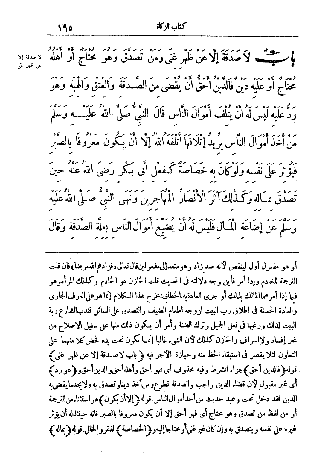 أو هو مفعول أول لينقص لأنه ضد زاد وهو متعد إلى مفعولين قال تعالى (فزادهم الله مرضاً) فإن قلت الترجمة للخادم وإذا أمر فأين وجه دلالته في الحديث قلت الخازن هو الخادم وكذلك المرأة وهو فيما إذا أمرهما المالك بذلك أو جرى العادة به الخطابي: مخرج هذا الكلام إنما هو على العرف الجاري والعادة الحسنة في إطلاق رب البيت لزوجه إطعام الضيف والتصدق على السائل فندب الشارع ربة البيت لذلك ورغبها في فعل الجميل وترك الضنة وأمر أن يكون ذلك منها على سبيل الإصلاح من غير إفساد ولا إسراف والخازن كذلك لأن الشيء غالباً إنما يكون تحت يده فحض كلا منهما على التعاون لئلا يقصر في استبقاء الحظ نمه وحيازة الأجر فيه (باب لا صدقة إلا عن ظهر غني) قوله (فالدين أحق) جزاء الشرط وفيه محذوف أي فهو أحق وأهله أحق والدين أحق و (هو رد) أي غير مقبول لأن قضاء الدين واجب والصدقة تطوع ومن أخذ ديناً وتصدق به ولا يجد ما يقضي به الدين فقد دخل تحت وعيد حديث من أخذ أموال الناس. قوله (إلا أن يكون) هو استثناء من الترجمة أو من لفظ من تصدق وهو محتاج أي فهو أحق إلا أن يكون معروفاً بالصبر فإنه حينئذ له أن يؤثر غيره على نفسه ويتصدق به وإن كان غير غني أو محتاجاً إليه و (الخصاصة) الفقر والخلل. قوله (بماله)
