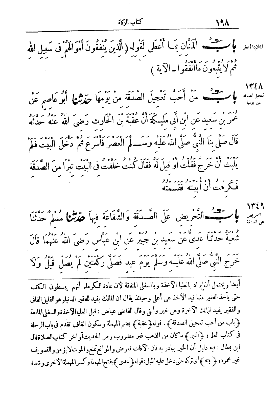 أيضاً ويحتمل أن يراد بالعليا الآخذة وبالسفلى المنفقة لأن عادة الكرماء أنهم يبسطون الكف حتى يأخذ الفقير منها قيد الآخذ هي أعلى وحينئذ يقال أن المالك يفيد للفقير الدنيا وهو القليل الفاني والفقير يفيد للمالك الآخرة وهي خير وأبقى وقال القاضي عياض: قيل العليا الآخذة والسفلى المانعة (باب من أحب تعجيل الصدقة). قوله (عقبة) بضم المهملة وسكون القاف تقدم في باب الرحلة في كتاب العلم و (التبر) ما كان من الذهب غير مضروب ومر الحديث أواخر كتاب الصلاة قال ابن بطال: فيه دليل أن الخير يبادر به فإن الآفات تعرض والموانع تمنع والموت لا يؤمن والتسويف غير محمود و (بيته) أي تركه حتى دخل عليه الليل: قوله (عدي) بفتح المهملة وكسر المهملة الأخرى وشدة
