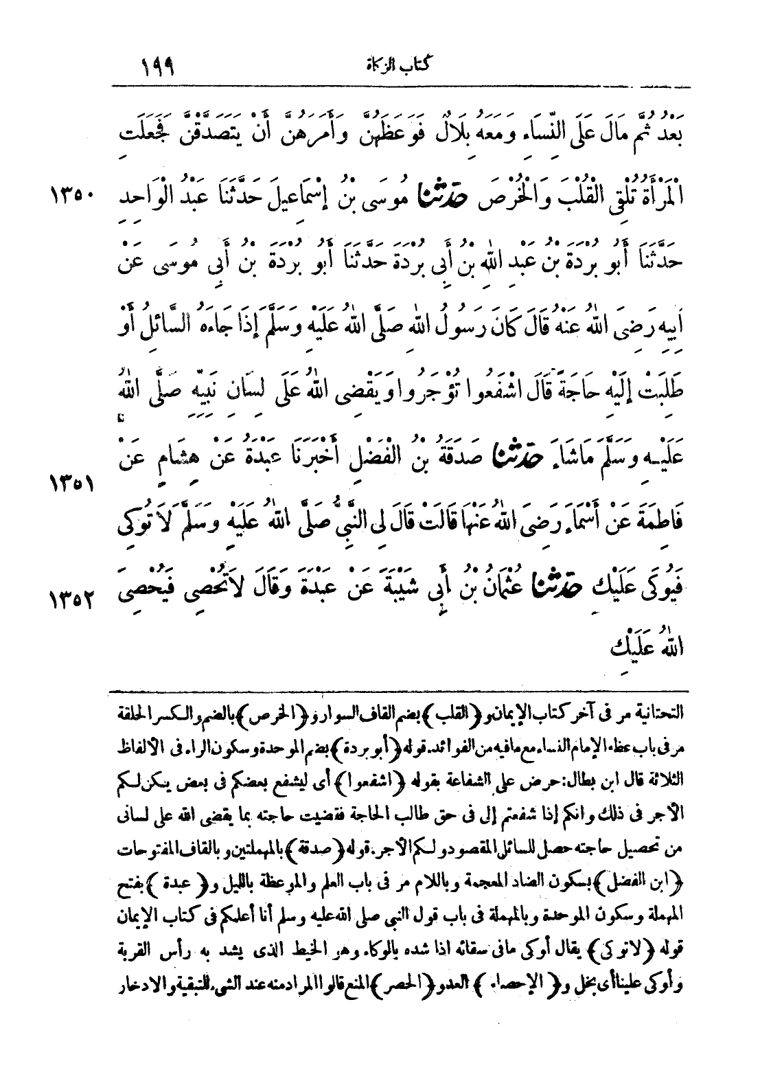 التحتانية مر في آخر كتاب الإيمان و (القلب) بضم القاف السوار و (الخرص) بالضم والكسر الحلقة مر في باب عظة الإمام النساء مع ما فيه من الفوائد قوله (أبو بردة) بضم الموحدة وسكون الراء في الألفاظ الثلاثة قال ابن بطال: حرض على الشفاعة بقوله (اشفعوا) أليشفع بعضكم في بعض يكن لكم الأجر في ذلك وأنكم إذا شفعتم إلى في حق طالب الحاجة فقضيت حاجته بما يقضي الله على لساني من تحصيل حاجته حصل للسائل المقصود ولكم الأجر. قوله (صدقة) بالمهملتين وبالقاف المفتوحات (ابن الفضل) بسكون الضاد المعجمة وباللام مر في باب العلم والموعظة بالليل و (عبدة) بفتح المهملة وسكون الموحدة وبالمهملة في باب قول النبي صلى الله عليه وسلّم أنا أعلمكم في كتاب الإيمان قوله (لا توكي) يقال أوكي ما في سقائه إذا شده بالوكاء وهو الخيط الذي يشد به رأس القربة وأوكي علينا أي بخل و (الإحصاء) العدو (الحصر) المنع قالوا المراد منه عند الشيء للتبقية والادخار