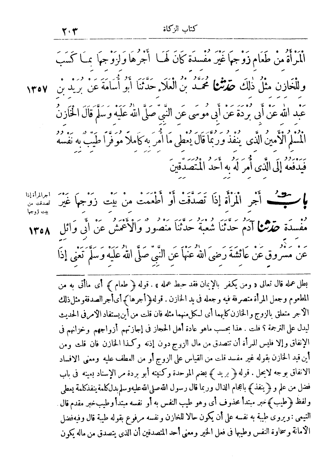 باب أَجْرِ الْمَرْأَةِ إِذَا تَصَدَّقَتْ أَوْ أَطْعَمَتْ مِنْ بَيْتِ زَوْجِهَا غَيْرَ مُفْسِدَةٍ