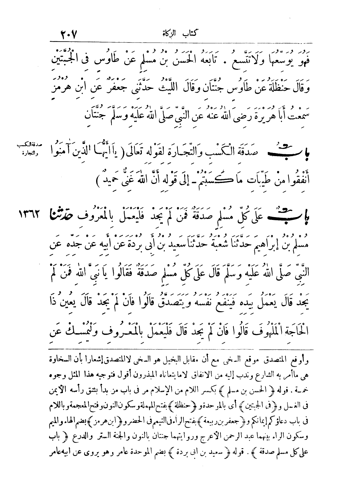 وأوقع المتصدق موقع السخي مع أن مقابل البخيل هو السخي لا المتصدق إشعاراً بأن السخاوة هي ما أمر به الشارع وندب إليه من الإنفاق لا ما يتعاناه المبذرون أقول فتوجيه هذا المثل وجوه خمسة. قوله (الحسن بن مسلم) بكسر اللام من الإسلام مر في باب من بدأ بشق رأسه الأيمن في الغسل و (في الجبتين) أي بالموحدة و (حنظلة) بفتح المهملة وسكون النون وفتح المعجمة وباللام في باب دعاؤكم إيمانكم و (جعفر بن ربيعة) بفتح الراء في التيمم في الحضر و (ابن هرمز) بضم الهاء والميم وسكون الراء بينهما عبد الرحمن الأعرج وروايتهما جنتان بالنون والجنة الستر والدرع (باب على كل مسلم صدقة). قوله (سعيد بن أبي بردة) بضم الموحدة عامر وهو يروي عن أبيه عامر