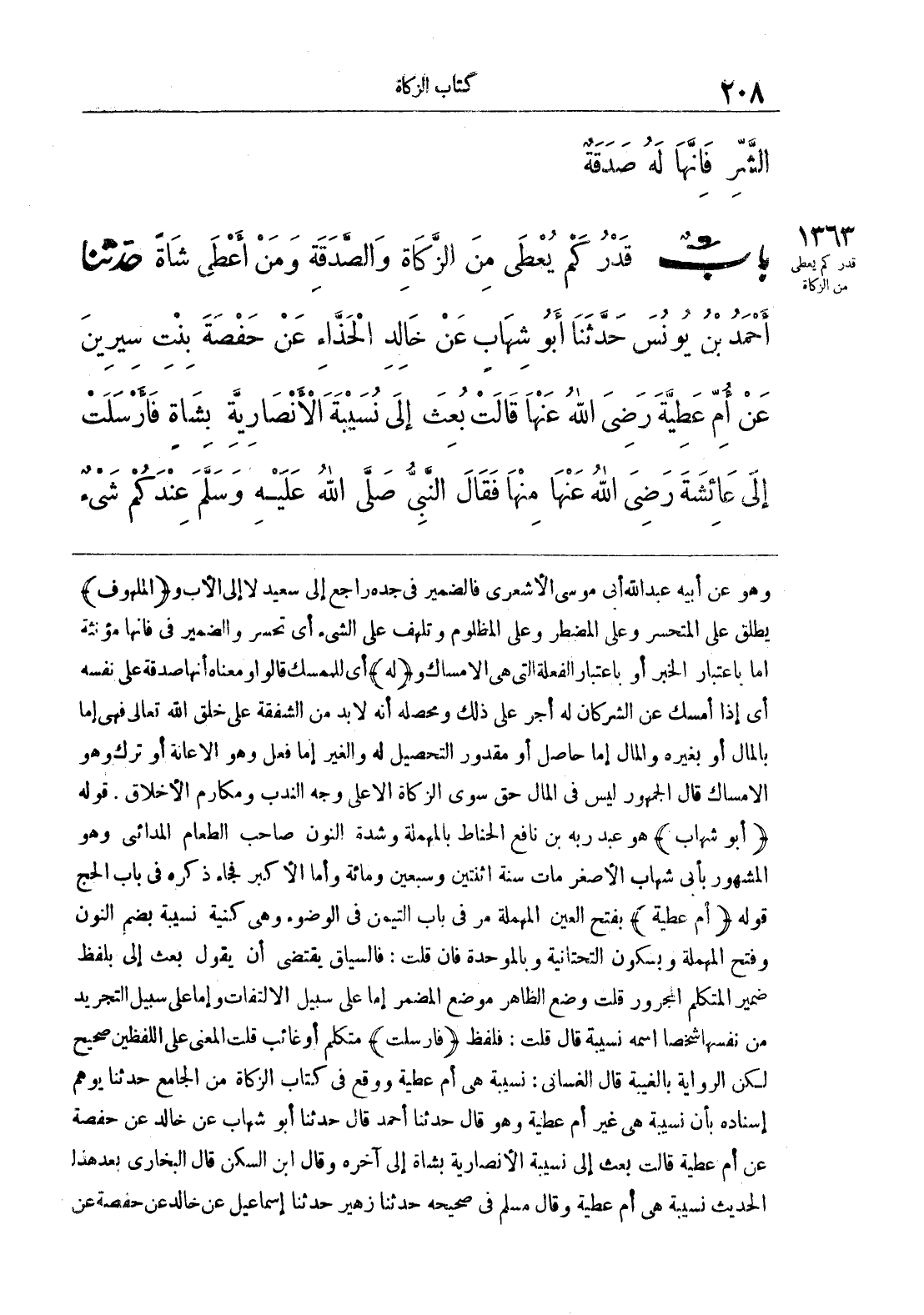 1363 - حَدَّثَنَا أَحْمَدُ بْنُ يُونُسَ حَدَّثَنَا أَبُو شِهَابٍ عَنْ خَالِدٍ الْحَذَّاءِ عَنْ حَفْصَةَ بِنْتِ سِيرِينَ عَنْ أُمِّ عَطِيَّةَ رضى الله عنها قَالَتْ بُعِثَ إِلَى نُسَيْبَةَ الأَنْصَارِيَّةِ بِشَاةٍ فَأَرْسَلَتْ إِلَى عَائِشَةَ - رضى الله عنها - مِنْهَا فَقَالَ النَّبِىُّ صلى الله عليه وسلّم «عِنْدَكُمْ شَىْءٌ»