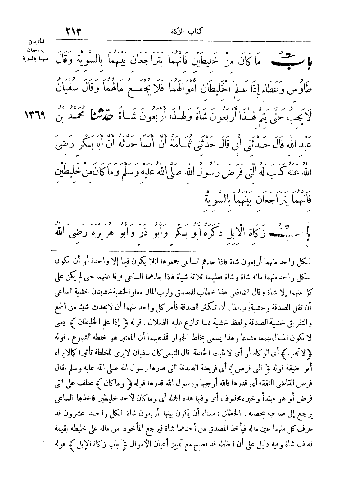 لكل واحد منهما أربعون شاة فإذا جاءهم الساعي جمعوها لئلا يكون فيها إلا واحدة أو أن يكون لكل واحد منهما مائة شاة وشاة فعيهما ثلاثة شياه فإذا جاءهما الساعي فرقا عنهما حتى لم يكن على كل منهما إلا شاة وقال الشافعي هذا خطاب للمصدق ولرب المال معاً والخشية خشيتان خشية الساعي أن تقل الصدقة وخشية رب المال أن تكثر الصدقة فأمر كل واحد منهما أن لا يحدث شيئاً من الجمع والتفريق خشية الصدقة ولفظ خشية مما تنازع عليه الفعلان. قوله (إذا علم الخليطان) يعني لا يكون المال بينهما مشاعاً وهذا يسمى بخلط الجوار فمذهبهما أن المعتبر هو خلطة الشيوع. قوله (لا تجب) أي الزكاة أو أي لا تثبت الخلطة قال التيمي كان سفيان لا يرى للخلطة تأثيراً كما لا يراه أبو حنيفة قوله (التي فرض) أي فريضة الصدقة التي درها رسول الله صلى الله عليه وسلّم يقال فرض القاضي النفقة أي قدرها فالله أوجبها ورسول الله قدرها قوله (وما كان) عطف على التي فرض أو هو مبتدأ وخبره محذوف أي وفيها هذه الجملة أي وما كان لأحد خليطين فأخذهما الساعي يرجع إلى صاحبه بحصته. الخطابي: معناه أن يكون بينها أربعون شاة لكل واحد عشرون قد عرف كل منهما عين ماله فيأخذ المصدق من أحدهما شاة فيرجع المأخوذ من ماله على خليطه بقيمة نصف شاة وفيه دليل على أن الخلطة قد تصح مع تمييز أعيان الأموال (باب زكاة الإبل) قوله