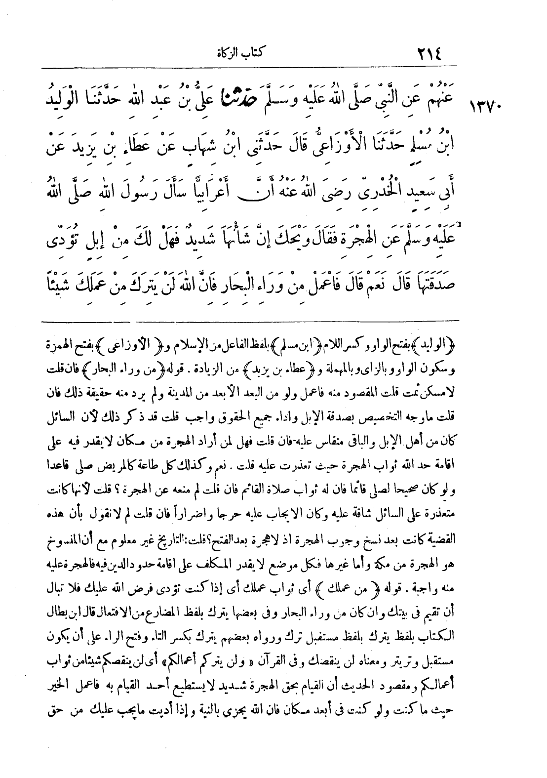 1370 - حَدَّثَنَا عَلِىُّ بْنُ عَبْدِ اللَّهِ حَدَّثَنَا الْوَلِيدُ بْنُ مُسْلِمٍ حَدَّثَنَا الأَوْزَاعِىُّ قَالَ حَدَّثَنِى ابْنُ شِهَابٍ عَنْ عَطَاءِ بْنِ يَزِيدَ عَنْ أَبِى سَعِيدٍ الْخُدْرِىِّ - رضى الله عنه - أَنَّ أَعْرَابِيًّا سَأَلَ رَسُولَ اللَّهِ صلى الله عليه وسلّم عَنِ الْهِجْرَةِ فَقَالَ «وَيْحَكَ، إِنَّ شَانَهَا شَدِيدٌ، فَهَلْ لَكَ مِنْ إِبِلٍ تُؤَدِّى صَدَقَتَهَا». قَالَ نَعَمْ. قَالَ «فَاعْمَلْ مِنْ وَرَاءِ الْبِحَارِ فَإِنَّ اللَّهَ لَنْ يَتِرَكَ مِنْ عَمَلِكَ شَيْئاً».