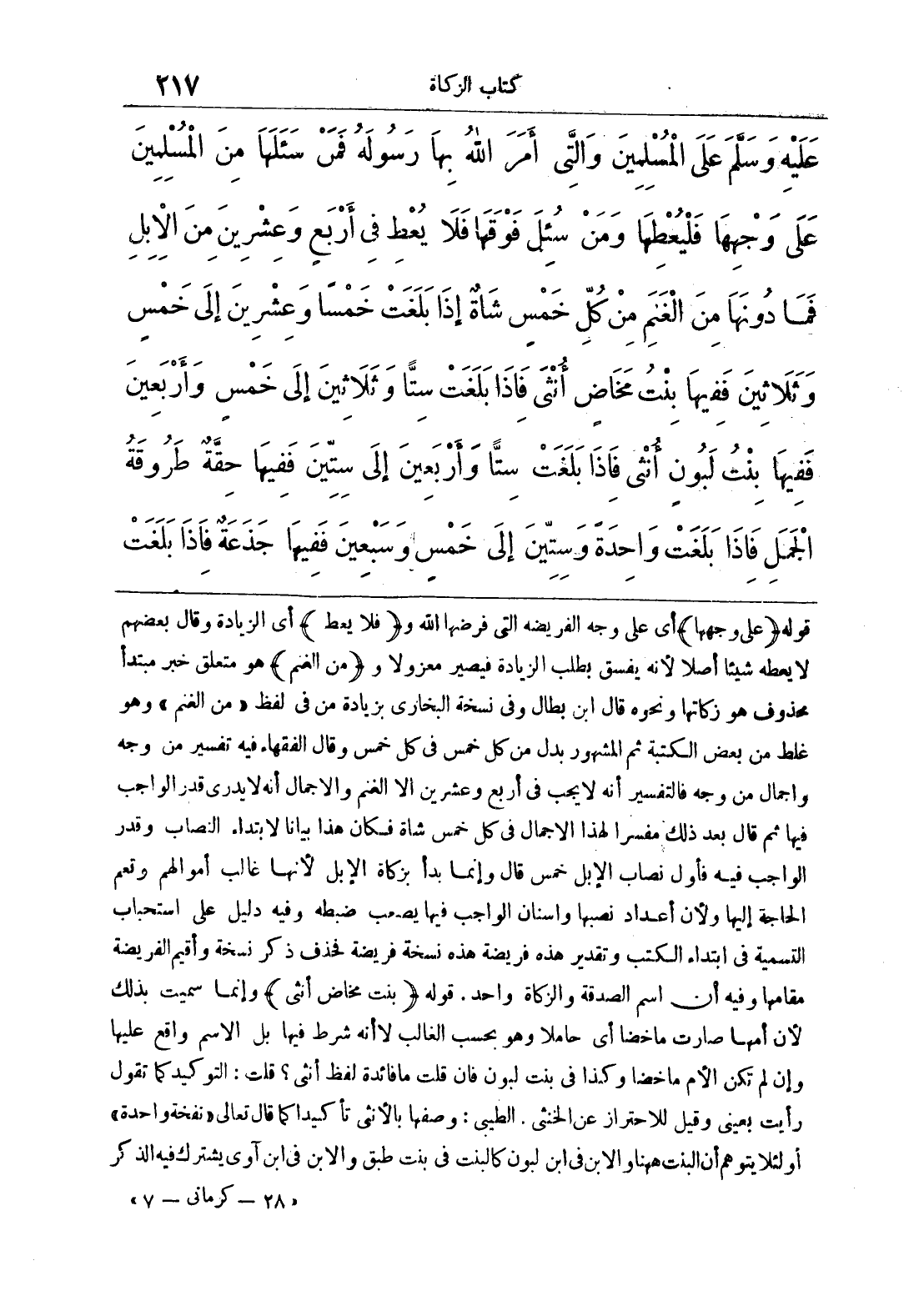 قوله (على وجهها) أي على وجه الفريضة التي فرضها الله و (فلا يعط) أي الزيادة وقال بعضهم لا يعطه شيئاً أصلاً لأنه يفسق بطلب الزيادة فيصير معزولاً و (من الغنم) هو متعلق خبر مبتدأ محذوف هو زكاتها ونحوه قال ابن بطال وفي نسخة البخاري بزيادة من في لفظ (من الغنم) وهو غلط من بعض الكتبة ثم المشهور بدل من كل خمس في كل خمس وقال الفقهاء فيه تفسير من وجه وإجمال من وجه فالتفسير انه لا يجب في أربع وعشرين إلا الغنم والإجمال أنه لا يدري قدر الواجب فيها ثم قال بعد ذلك مفسراً لهذا الإجمال في كل خمس شاة فكان هذا بياناً لابتداء النصاب وقدر الواجب فيه فأول نصاب الإبل خمس قال وإنما بدأ بزكاة الإبل لأنها غالب أموالهم وتعم الحاجة إليها ولأن أعداد نصبها وأسنان الواجب فيها يصعب ضبطه وفيه دليل على استحباب التسمية في ابتداء الكتب وتقدير هذه فريضة هذه نسخة فريضة فحذف ذكر نسخة وأقيم الفريضة مقامها وفيه أن اسم الصدقة والزكاة واحد. قوله (بنت مخاض أنثى) وإنما سميت بذلك لأن أمها صارت ماخضاً أي حاملاً وهو يحسب الغالب لا أنه شرط فيها بل الاسم واقع عليها وإن لم تكن الأم ماخضاً وكذا في بنت لبون فإن قلت ما فائدة لفظ أنثى؟ قلت: التوكيد كما تقول رأيت بعيني وقيل للاحتراز عن الخنثى. الطيبي: وصفها بالأنثى تأكيداً كما قال تعالى (نفخة واحدة) أو لئلا يتوهم أن البنت ههنا والابن في ابن لبون كالبنت في بنت طبق والابن في ابن آوي يشترك فيه الذكر