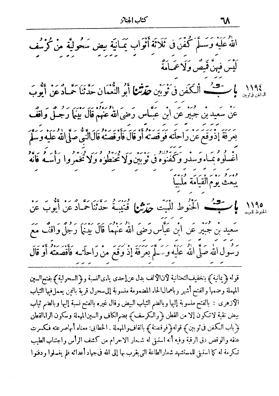 قوله (يمانية) بتخفيف التحتانية لأن الألف بدل عن إحدى ياءي النسبة و (السحولية) بفتح السين المهملة وضمها والفتح أشهر وبإهمال الحاء المضمومة منسوبة إلى سحول قرية باليمن يعمل فيها الثياب الأزهري: بالفتح منسوبة إليها وبالضم الثياب البيض وقال غيره بالفتح نسبة إليها وبالضم ثياب بيض نقية لا تكون إلا من القطن (والكرسف) بضم الكاف والسين المهملة وسكون الراء القطن (باب الكفن في ثوبين) قوله (فرقصته) بالقاف والمهملة. الخطابي: معناه أنها صرعته فكسرت عنقه والوقص دق الرقبة وفيه أن استبقى له شعار الإحرام من كشف الرأس واجتناب الطيب تكرمة له كما استبقى للمستشهد شعار الطاعة التي بقرب بها إلى الله في جهاد أعدائه فلم يغسلوا ودفنوا