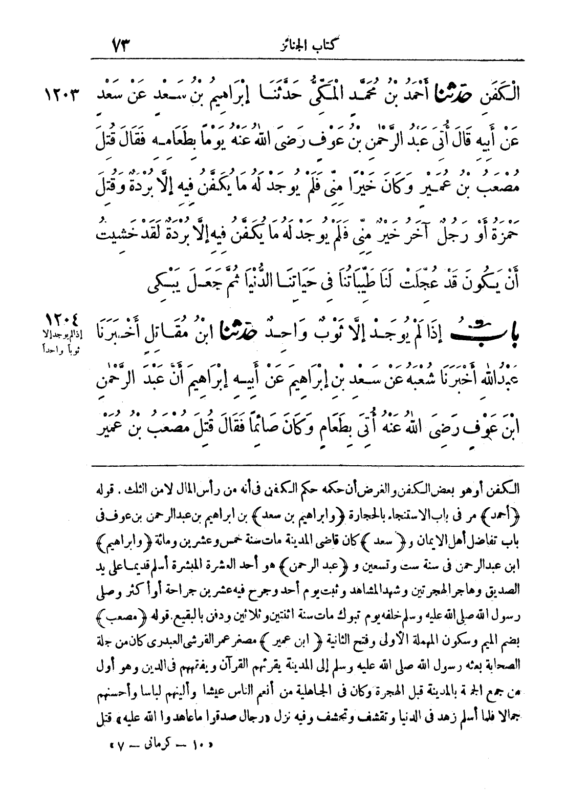 الكفن أو هو بعض الكفن والغرض أن حكمه حكم الكفن في أنه من رأس المال لا من الثلث. قوله (أحمد) مر في باب الاستنجاء بالحجارة (وإبراهيم بن سعد) بن إبراهيم بن عبد الرحمن بن عوف في باب تفاضل أهل الإيمان و (سعد) كان قاضي المدينة مات سنة خمس وعشرين ومائة (وإبراهيم) ابن عبد الرحمن في سنة ست وتسعين و (عبد الرحمن) هو أحد العشرة المبشرة أسلم قديماً على يد الصديق وهاجر الهجرتين وشهد المشاهد وثبت يوم أحد وجرح فيه عشرين جراحة أو أكثر وصلى رسول الله صلى الله عليه وسلّم خلفه يوم تبوك مات سنة اثنتين وثلاثين ودفن بالبقيع. قوله (مصعب) بضم الميم وسكون المهملة الأولى وفتح الثانية (ابن عمير) مصغر عمر القرشي العبدري كان من جملة الصحابة بعثه رسول الله صلى الله عليه وسلّم إلى المدينة يقرئهم القرآن ويفقههم في الدين وهو أول من جمع الجمعة بالمدينة قبل الهجرة وكان في الجاهلية من أنعم الناس عيشاً وألينهم لباساً وأحسنهم جمالاً فلما أسلم زهد في الدنيا وتقشف وتحشف وفيه نزل (رجال صدقوا ما عاهدوا الله عليه) قتل