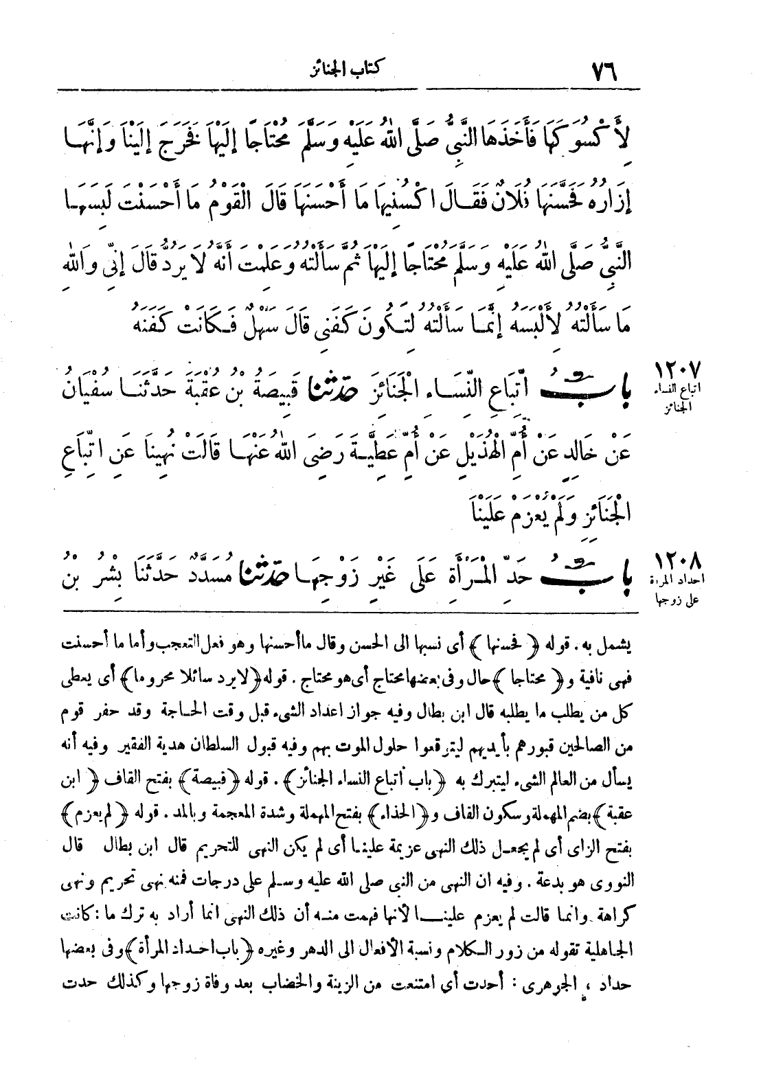 يشمل به. قوله (فحسنها) أي نسبها إلى الحسن وقال ما أحسنها وهو فعل التعجب وأما ما أحسنت فهي نافية و (محتاجاً) حال وفي بعضها محتاج أي هو محتاج. قوله (لا يرد سائلاً محروماً) أي يعطي كل من يطلب ما يطلبه قال ابن بطال وفيه جواز إعداد الشيء قبل وقت الحاجة وقد حفر قوم من الصالحين قبورهم بأيديهم ليتوقعوا حلول الموت بهم وفيه قبول السلطان هدية الفقير وفيه أنه يسأل من العالم الشيء ليتبرك به (باب إتباع النساء الجنائز). قوله (قبيصة) بفتح القاف (ابن عقبة) بضم المهملة وسكون القاف و (الحذاء) بفتح المهملة وشدة المعجمة وبالمد. قوله (لم يعزم) بفتح الزاي أي لم يجعل ذلك النهي عزيمة علينا أي لم يكن النهي للتحريم قال ابن بطال: قال النووي هو بدعة. وفيه أن النهي من النبي صلى الله عليه وسلّم على درجات فمنه نهى تحريم ونهي كراهة. وإنما قالت لم يعزم علينا لأنها فهمت منه أن ذلك النهي إنما أراد به ترك ما: كانت الجاهلية تقوله من زور الكلام ونسبة الأفعال إلى الدهر وغيره (باب حداد المرأة) وفي بعضها حداد، الجوهري: أحدت أي امتنعت من الزينة والخضاب بعد وفاة زوجها وكذلك حدت
