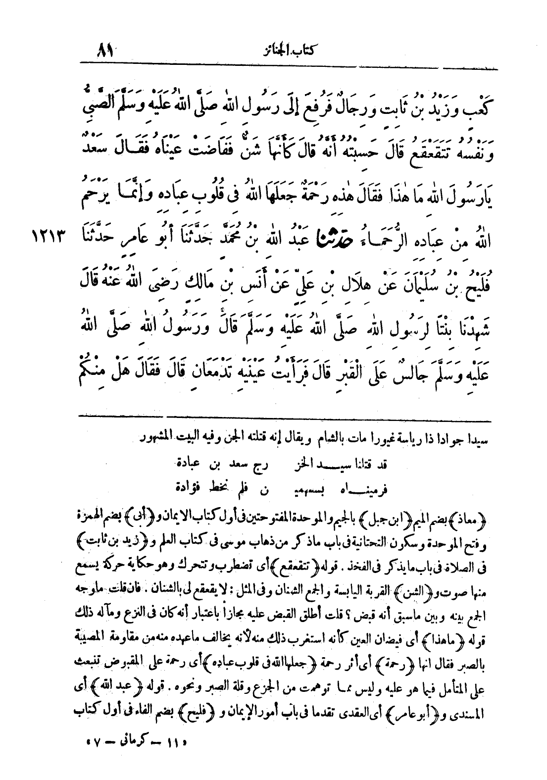 كَعْبٍ وَزَيْدُ بْنُ ثَابِتٍ وَرِجَالٌ، فَرُفِعَ إِلَى رَسُولِ اللَّهِ صلى الله عليه وسلّم الصَّبِىُّ وَنَفْسُهُ تَتَقَعْقَعُ - قَالَ حَسِبْتُهُ أَنَّهُ قَالَ - كَأَنَّهَا شَنٌّ. فَفَاضَتْ عَيْنَاهُ. فَقَالَ سَعْدٌ يَا رَسُولَ اللَّهِ مَا هَذَا فَقَالَ «هَذِهِ رَحْمَةٌ جَعَلَهَا اللَّهُ فِى قُلُوبِ عِبَادِهِ، وَإِنَّمَا يَرْحَمُ اللَّهُ مِنْ عِبَادِهِ الرُّحَمَاءَ».