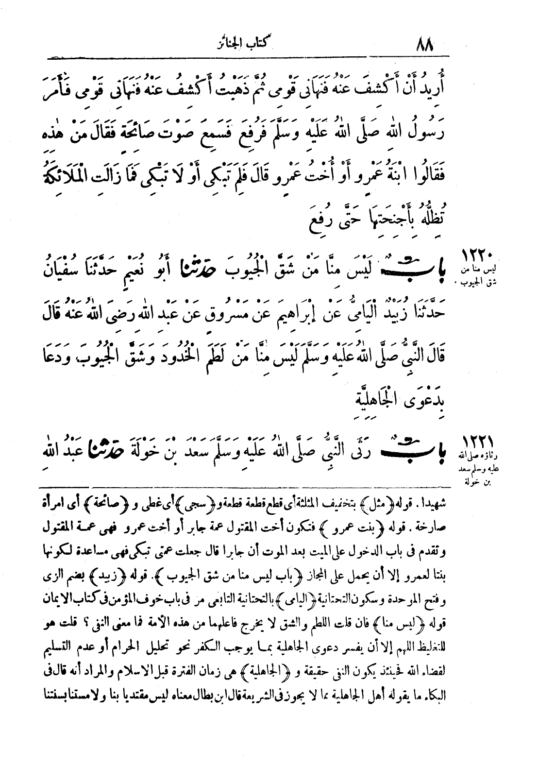 1220 - حَدَّثَنَا أَبُو نُعَيْمٍ حَدَّثَنَا سُفْيَانُ حَدَّثَنَا زُبَيْدٌ الْيَامِىُّ عَنْ إِبْرَاهِيمَ عَنْ مَسْرُوقٍ عَنْ عَبْدِ اللَّهِ - رضى الله عنه - قَالَ قَالَ النَّبِىُّ صلى الله عليه وسلّم «لَيْسَ مِنَّا مَنْ لَطَمَ الْخُدُودَ، وَشَقَّ الْجُيُوبَ، وَدَعَا بِدَعْوَى الْجَاهِلِيَّةِ».