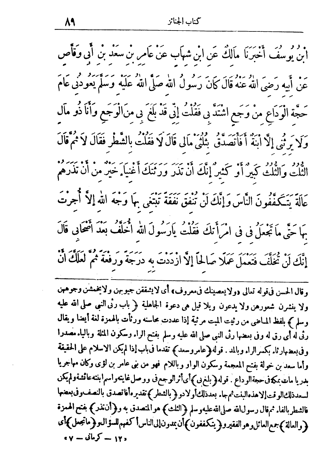ابْنُ يُوسُفَ أَخْبَرَنَا مَالِكٌ عَنِ ابْنِ شِهَابٍ عَنْ عَامِرِ بْنِ سَعْدِ بْنِ أَبِى وَقَّاصٍ عَنْ أَبِيهِ - رضى الله عنه - قَالَ كَانَ رَسُولُ اللَّهِ صلى الله عليه وسلّم يَعُودُنِى عَامَ حَجَّةِ الْوَدَاعِ مِنْ وَجَعٍ اشْتَدَّ بِى فَقُلْتُ إِنِّى قَدْ بَلَغَ بِى مِنَ الْوَجَعِ وَأَنَا ذُو مَالٍ، وَلاَ يَرِثُنِى إِلاَّ ابْنَةٌ، أَفَأَتَصَدَّقُ بِثُلُثَىْ مَالِى قَالَ «لاَ». فَقُلْتُ بِالشَّطْرِ فَقَالَ «لاَ» ثُمَّ قَالَ «الثُّلُثُ وَالثُّلْثُ كَبِيرٌ - أَوْ كَثِيرٌ - إِنَّكَ أَنْ تَذَرَ وَرَثَتَكَ أَغْنِيَاءَ خَيْرٌ مِنْ أَنْ تَذَرَهُمْ عَالَةً يَتَكَفَّفُونَ النَّاسَ، وَإِنَّكَ لَنْ تُنْفِقَ نَفَقَةً تَبْتَغِى بِهَا وَجْهَ اللَّهِ إِلاَّ أُجِرْتَ بِهَا، حَتَّى مَا تَجْعَلُ فِى فِى امْرَأَتِكَ». فَقُلْتُ يَا رَسُولَ اللَّهِ، أُخَلَّفُ بَعْدَ أَصْحَابِى قَالَ «إِنَّكَ لَنْ تُخَلَّفَ فَتَعْمَلَ عَمَلاً صَالِحاً إِلاَّ ازْدَدْتَ بِهِ دَرَجَةً وَرِفْعَةً، ثُمَّ لَعَلَّكَ أَنْ