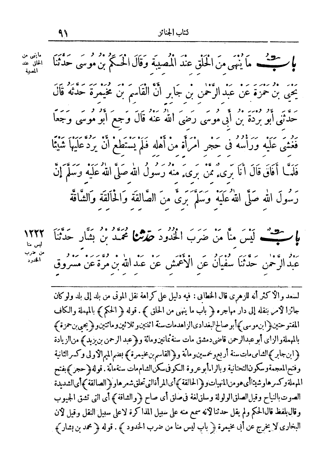 لسعد والأكثر أنه للزهري قال الخطابي: فيه دليل على كراهة نقل الموتى من بلد إلى بلد ولو كان جائزاً لأمر ينقله إلى دار مهاجره (باب ما ينهى من الحلق). قوله (الحكم) بالمهملة والكاف المفتوحتين (ابن موسى) أبو صالح البغدادي الزاهد مات سنة اثنتين وثلاثين ومائتين و (يحيى بن حمزة) بالمهملة والزاي أبو عبد الرحمن قاضي دمشق مات سنة ثمانين ومائة و (عبد الرحمن بن يزيد) من الزيادة (ابن جابر) الشامي مات سنة أربع وخمسين ومائة و (القاسم بن مخيمرة) بضم الميم الأولى وكسر الثانية وفتح المعجمة وسكون التحتانية وبالراء أبو عروة الكوفي سكن الشام مات سنة مائة. قوله (حجر) بفتح المهملة وكسرها وشيئاً أي هو من المنهيات و (الحالقة) أي المرأة التي تحلق شعرها و (الصالقة) أي الشديدة الصوت بالنياح وقيل الصلق الولولة وسلق لغة في صلق أي صاح (والشاقة) أي التي تشق الجيوب وقال بلفظ قال الحكم ولم يقل حدثنا لأنه سمع منه على سبيل المذاكرة لا على سبيل النقل وقيل لأن البخاري لا يخرج عن أبي مخيمرة (باب ليس منا من ضرب الخدود). قوله (محمد بن بشار)