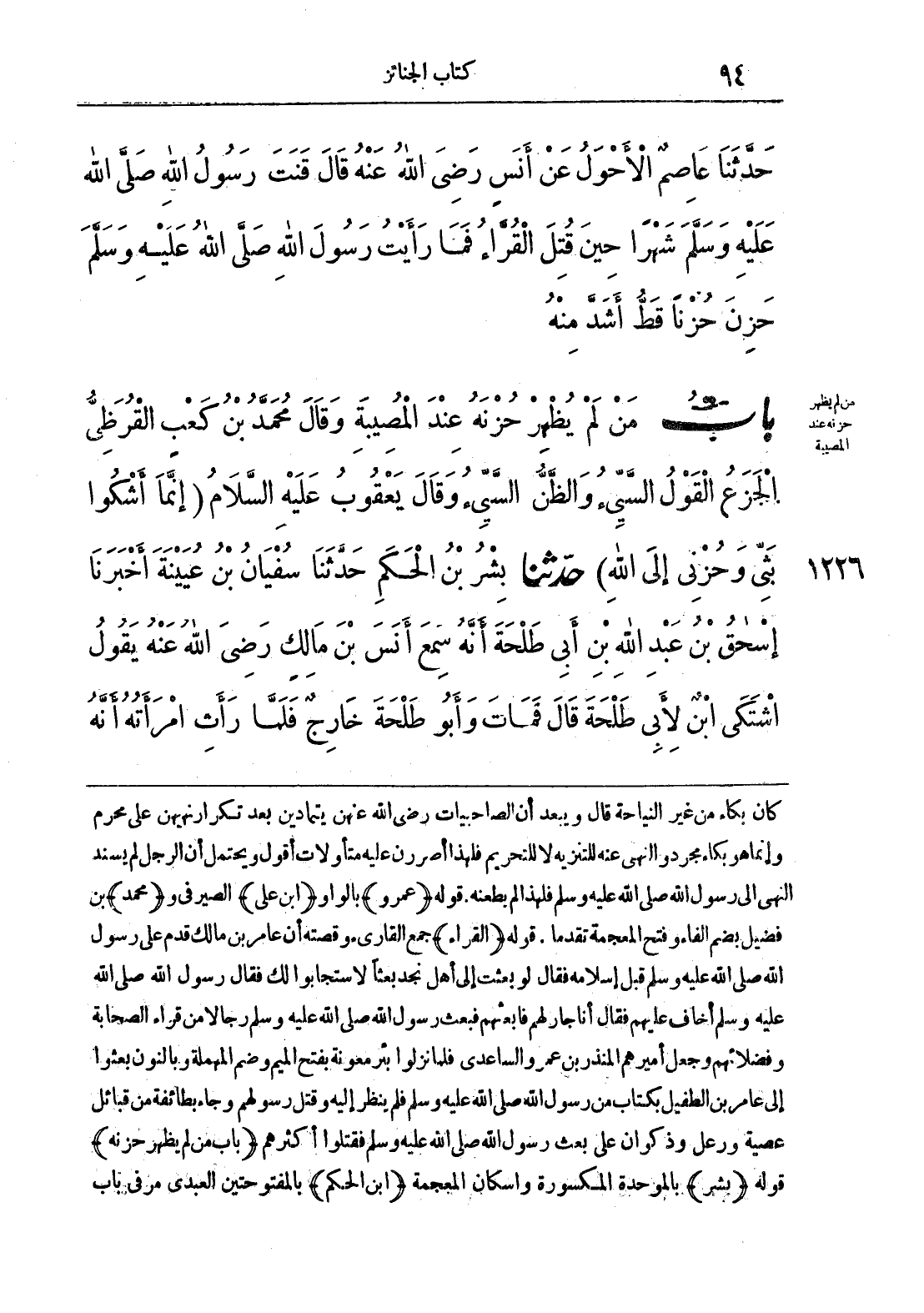 حَدَّثَنَا عَاصِمٌ الأَحْوَلُ عَنْ أَنَسٍ - رضى الله عنه - قَالَ قَنَتَ رَسُولُ اللَّهِ صلى الله عليه وسلّم شَهْراً حِينَ قُتِلَ الْقُرَّاءُ، فَمَا رَأَيْتُ رَسُولَ اللَّهِ صلى الله عليه وسلّم حَزِنَ حُزْناً قَطُّ أَشَدَّ مِنْهُ.