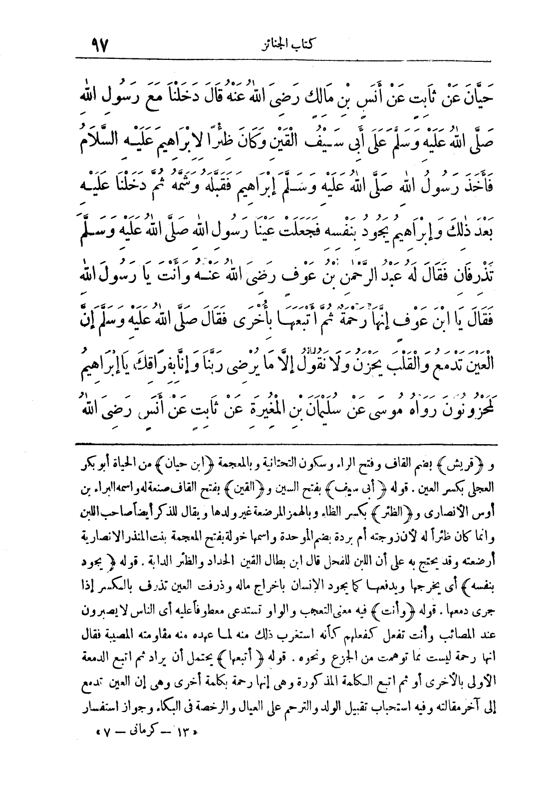 حَيَّانَ عَنْ ثَابِتٍ عَنْ أَنَسِ بْنِ مَالِكٍ - رضى الله عنه - قَالَ دَخَلْنَا مَعَ رَسُولِ اللَّهِ صلى الله عليه وسلّم عَلَى أَبِى سَيْفٍ الْقَيْنِ وَكَانَ ظِئْراً لإِبْرَاهِيمَ عَلَيْهِ السَّلاَمُ فَأَخَذَ رَسُولُ اللَّهِ صلى الله عليه وسلّم إِبْرَاهِيمَ فَقَبَّلَهُ وَشَمَّهُ، ثُمَّ دَخَلْنَا عَلَيْهِ بَعْدَ ذَلِكَ، وَإِبْرَاهِيمُ يَجُودُ بِنَفْسِهِ، فَجَعَلَتْ عَيْنَا رَسُولِ اللَّهِ صلى الله عليه وسلّم تَذْرِفَانِ. فَقَالَ لَهُ عَبْدُ الرَّحْمَنِ بْنُ عَوْفٍ - رضى الله عنه - وَأَنْتَ يَا رَسُولَ اللَّهِ فَقَالَ «يَا ابْنَ عَوْفٍ إِنَّهَا رَحْمَةٌ». ثُمَّ أَتْبَعَهَا بِأُخْرَى فَقَالَ صلى الله عليه وسلّم «إِنَّ الْعَيْنَ تَدْمَعُ، وَالْقَلْبَ يَحْزَنُ، وَلاَ نَقُولُ إِلاَّ مَا يَرْضَى رَبُّنَا، وَإِنَّا بِفِرَاقِكَ يَا إِبْرَاهِيمُ لَمَحْزُونُونَ». رَوَاهُ مُوسَى عَنْ سُلَيْمَانَ بْنِ الْمُغِيرَةِ عَنْ ثَابِتٍ عَنْ أَنَسٍ - رضى الله