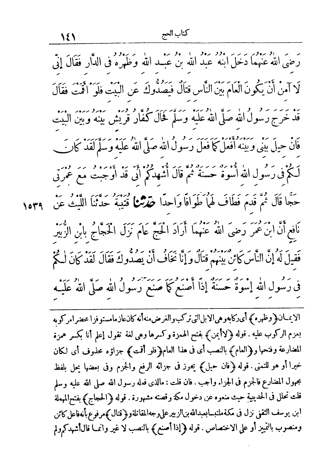 رَضِيَ اللَّهُ عَنْهُمَا دَخَلَ ابْنُهُ عَبْدُ اللَّهِ بْنُ عَبْدِ اللَّهِ وَظَهْرُهُ فِي الدَّارِ فَقَالَ إِنِّي لَا آمَنُ أَنْ يَكُونَ الْعَامَ بَيْنَ النَّاسِ قِتَالٌ فَيَصُدُّوكَ عَنْ الْبَيْتِ فَلَوْ أَقَمْتَ فَقَالَ قَدْ خَرَجَ رَسُولُ اللَّهِ صَلَّى اللَّهُ عَلَيْهِ وَسَلَّمَ فَحَالَ كُفَّارُ قُرَيْشٍ بَيْنهُ وَبَيْنَ الْبَيْتِ فَإِنْ حِيلَ بَيْنِي وَبَيْنَهُ أَفْعَلُ كَمَا فَعَلَ رَسُولُ اللَّهِ صَلَّى اللَّهُ عَلَيْهِ وَسَلَّمَ {لَقَدْ كَانَ لَكُمْ فِي رَسُولِ اللَّهِ إِسْوَةٌ حَسَنَةٌ}