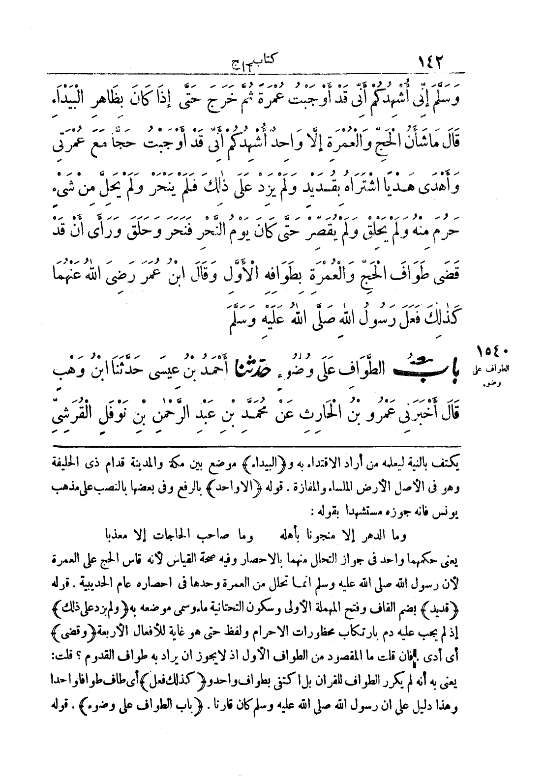 يعني حكمهما واحد في جواز التحلل منهما بالاحصار وفيه صحة القياس لأنه قاس الحج على العمرة لأن رسول الله صلى الله عليه وسلم إنما تحلل من العمرة وحدها في أحصاره عام الحديبية. قوله (قديد) بضم القاف وفتح المهملة الأولى وسكون التحتانية ماء وسمي موضعه به (ولم يزد على ذلك) إذ لم يجب عليه دم بارتكاب محظورات الإحرام ولفظ حتى هو غاية للأفعال الأربعة (وقضى) أي أدى فان قلت ما المقصود من الطواف الأول إذ لا يجوز إن يراد به طواف القدوم؟ قلت: يعني به أنه لم يكرر الطواف للقران بل اكتفى بطواف واحد و (كذلك فعل) أي طاف طوافا واحدا وهذا دليل على أن رسول الله صلى الله عليه وسلم كان قارنا. (باب الطواف على وضوء). قوله