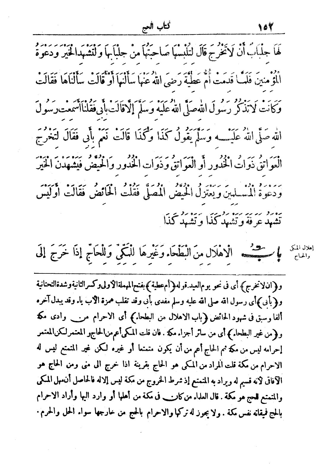 و (إن لا تخرج) أي في نحو يوم العيد. قوله (أم عطية) بفتح المهملة الأولى وكسر الثانية وشدة التحتانية و (بأبي) أي رسول الله صلى الله عليه وسلم مفدى بأبي وقد تقلب همزة الأب ياء وقد يبدل آخره ألفا وسبق في شهود الحائض (باب الإهلال من البطحاء) أي الإحرام من وادي مكة و (من غير البطحاء) أي من سائر أجزاء مكة. فان قلت المكي أعم من الحاج والمعتمر لكن المعتمر إحرامه ليس من مكة ثم الحاج أعم من أن يكون متمتعا أو غيره لكن غير المتمتع ليس له الإحرام من مكة قلت المراد من المكي هو الحاج بقرينة إذا خرج إلى منى ومن الحاج هو الآفاقي لأنه قسيم له ويراد به المتمتع إذ شرط الخروج من مكة ليس إلا له فالحاصل أن مهل المكي والمتمتع للحج هو مكة. قال العلماء من كان في مكة من أهلها أو وارد إليها وأراد الإحرام بالحج فميقاته نفس مكة. ولا يجوز له تركها والإحرام بالحج من خارجها سواء الحل والحرم.
