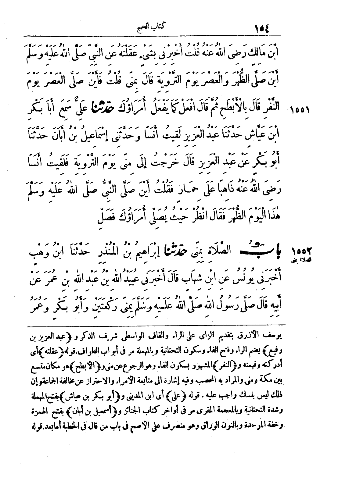 1552 - حَدَّثَنَا إِبْرَاهِيمُ بْنُ الْمُنْذِرِ حَدَّثَنَا ابْنُ وَهْبٍ أَخْبَرَنِي يُونُسُ عَنْ ابْنِ شِهَابٍ قَالَ أَخْبَرَنِي عُبَيْدُ اللَّهِ بْنُ عَبْدِ اللَّهِ بْنِ عُمَرَ عَنْ أَبِيهِ قَالَصَلَّى رَسُولُ اللَّهِ صَلَّى اللَّهُ عَلَيْهِ وَسَلَّمَ بِمِنًى رَكْعَتَيْنِ وَأَبُو بَكْرٍ وَعُمَرُ