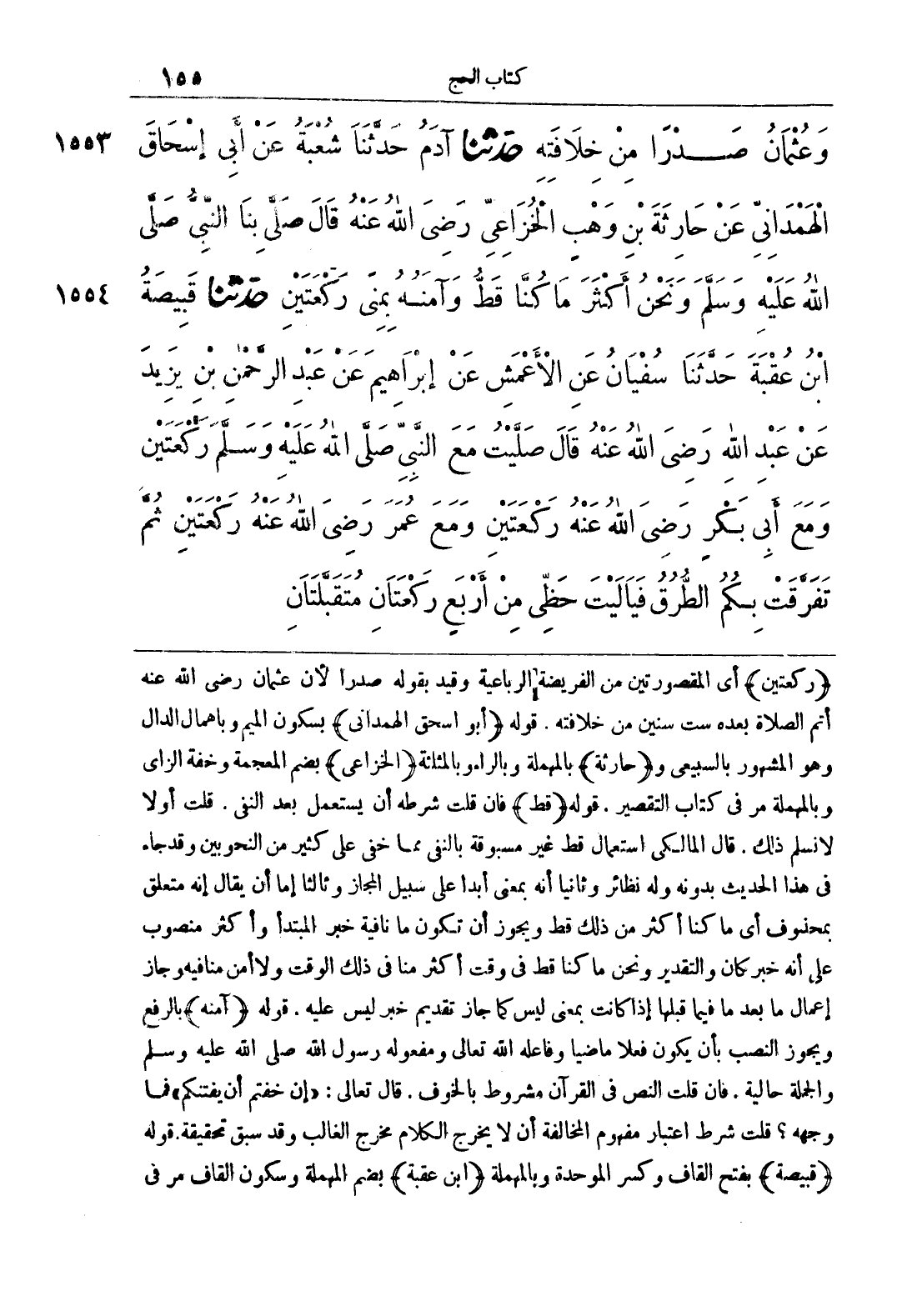 1554 - حَدَّثَنَا قَبِيصَةُ بْنُ عُقْبَةَ حَدَّثَنَا سُفْيَانُ عَنْ الْأَعْمَشِ عَنْ إِبْرَاهِيمَ عَنْ عَبْدِ الرَّحْمَنِ بْنِ يَزِيدَ عَنْ عَبْدِ اللَّهِ رَضِيَ اللَّهُ عَنْهُ قَالَ صَلَّيْتُ مَعَ النَّبِيِّ صَلَّى اللَّهُ عَلَيْهِ وَسَلَّمَ رَكْعَتَيْنِ وَمَعَ أَبِي بَكْرٍ رَضِيَ اللَّهُ عَنْهُ رَكْعَتَيْنِ وَمَعَ عُمَرَ رَضِيَ اللَّهُ عَنْهُ رَكْعَتَيْنِ ثُمَّ تَفَرَّقَتْ بِكُمْ الطُّرُقُ فَيَا لَيْتَ حَظِّي مِنْ أَرْبَعٍ رَكْعَتَانِ مُتَقَبَّلَتَانِ