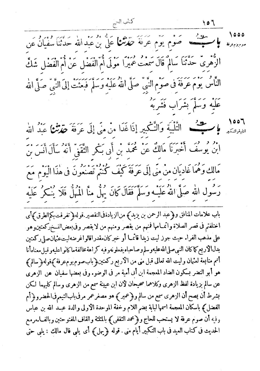 باب علامات المنافق و (عبد الرحمن بن يزيد) من الزيادة في التقصير. قوله (تفرقت بكم الطرق) أي اختلفتم في قصر الصلاة وإتمامها فمنهم من يقصر ومنهم من لا يقصر وفي بعض النسخ ركعتين وهو على مذهب الفراء حيث جوز ليت زيدا قائما أو خبر كان مقدرا قالوا غرضه ليت عثمان صلى ركعتين بدل الأربع كما كان النبي صلى الله عليه وسلم وصاحباه يفعلونه وفيه كراهة مخالفة ما كانوا عليه وقيل معناه أنا أتم متابعة لعثمان وليت الله تعالى قبل منى من الأربع ركعتين (باب صوم يوم عرفة) قوله (سالم) هو أبو النضر بسكون الضاد المعجمة ابن أبى أمية مر في الوضوء وفي بعضها سفيان عن الزهري عن سالم بزيادة لفظ الزهري وكلاهما صحيحان لأن ابن عيينة سمع من الزهري وسالم كليهما لكن بشرط أن يصح أن الزهري سمع من سالم و (عمير) هو مصغر عمر مر في باب التيمم في الحضرو (أم الفضل) بإسكان المعجمة اسمها لبابه بضم اللام وخفة الموحدة الأولى والدة عبد الله بن عباس وفيه أن صوم عرفة لا يستحب للحاج و (محمد الثقفي) بالمثلثة والقاف المفتوحتين وبالفاء مر مع الحديث في كتاب العيد في باب التكبير أيام منى. قوله (يهل) أي يلبي قال مالك: يلبي حتى