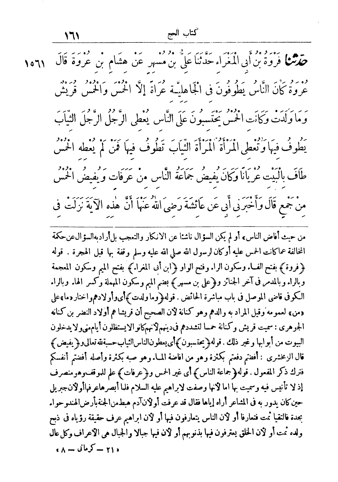 1561 - حَدَّثَنَا فَرْوَةُ بْنُ أَبِي الْمَغْرَاءِ حَدَّثَنَا عَلِيُّ بْنُ مُسْهِرٍ عَنْ هِشَامِ بْنِ عُرْوَةَ قَالَ عُرْوَةُ كَانَ النَّاسُ يَطُوفُونَ فِي الْجَاهِلِيَّةِ عُرَاةً إِلَّا الْحُمْسَ وَالْحُمْسُ قُرَيْشٌ وَمَا وَلَدَتْ وَكَانَتْ الْحُمْسُ يَحْتَسِبُونَ عَلَى النَّاسِ يُعْطِي الرَّجُلُ الرَّجُلَ الثِّيَابَ يَطُوفُ فِيهَا وَتُعْطِي الْمَرْأَةُ الْمَرْأَةَ الثِّيَابَ تَطُوفُ فِيهَا فَمَنْ لَمْ يُعْطِهِ الْحُمْسُ طَافَ بِالْبَيْتِ عُرْيَانًا وَكَانَ يُفِيضُ جَمَاعَةُ النَّاسِ مِنْ عَرَفَاتٍ وَيُفِيضُ الْحُمْسُ مِنْ جَمْعٍ قَالَ وَأَخْبَرَنِي أَبِي عَنْ عَائِشَةَ رَضِيَ اللَّهُ عَنْهَا أَنَّ هَذِهِ الْآيَةَ نَزَلَتْ فِي