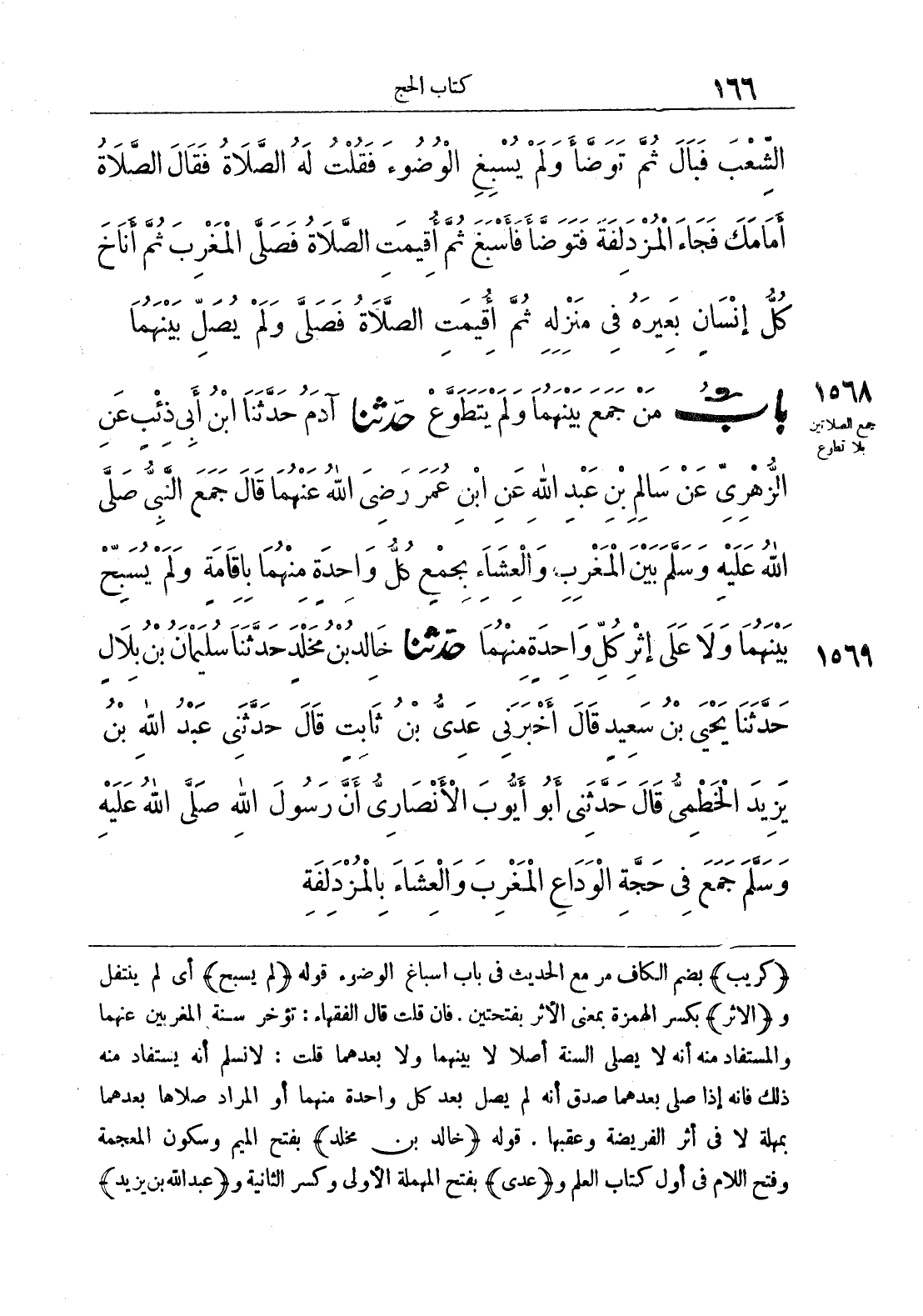 جَمَعَ النَّبِيُّ صَلَّى اللَّهُ عَلَيْهِ وَسَلَّمَ بَيْنَ الْمَغْرِبِ وَالْعِشَاءِ بِجَمْعٍ كُلُّ وَاحِدَةٍ مِنْهُمَا بِإِقَامَةٍ وَلَمْ يُسَبِّحْ بَيْنَهُمَا وَلَا عَلَى إِثْرِ كُلِّ وَاحِدَةٍ مِنْهُمَا