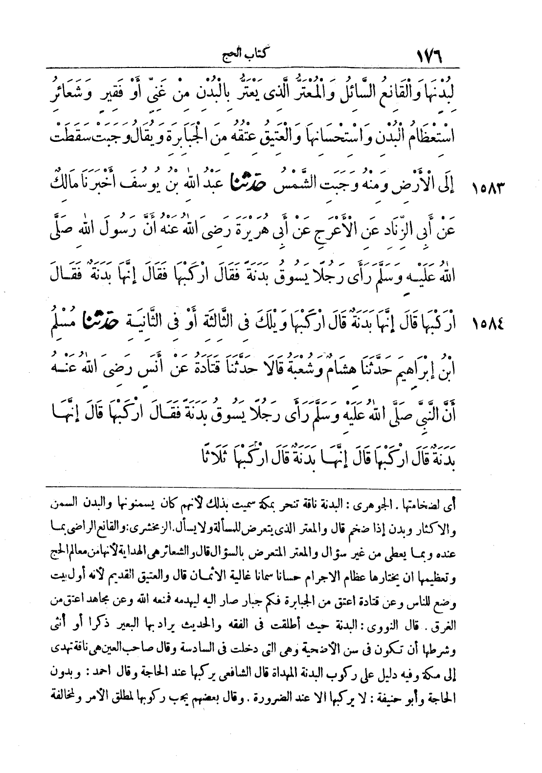 لِبُدْنِهَا وَالْقَانِعُ السَّائِلُ وَالْمُعْتَرُّ الَّذِي يَعْتَرُّ بِالْبُدْنِ مِنْ غَنِيٍّ أَوْ فَقِيرٍ وَشَعَائِرُ اسْتِعْظَامُ الْبُدْنِ وَاسْتِحْسَانُهَا وَالْعَتِيقُ عِتْقُهُ مِنْ الْجَبَابِرَةِ وَيُقَالُ وَجَبَتْ سَقَطَتْ إِلَى الْأَرْضِ وَمِنْهُ وَجَبَتْ الشَّمْسُ