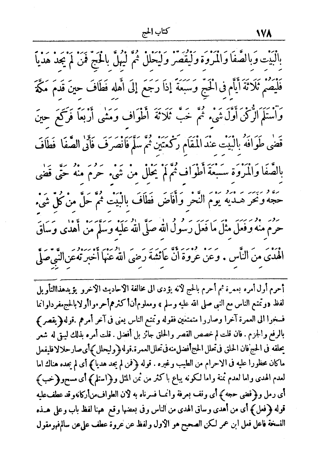أحرم أول أمره بعمرة ثم أحرم بالحج لأنه يؤدي إلى مخالفة الأحاديث الأخر ويؤيد هذا التأويل لفظ" وتمتع الناس مع النبي صلى الله عليه وسلم " ومعلوم أن أكثرهم أجرءوا أولا بالحج مفردا وإنما فسخوا إلى العمرة آخرا وصاروا متمتعين فقوله وتمتع الناس يعني في آخر أمرهم. قوله (يقصر) بالرفع والجزم. فان قلت لم خصص القصر والحلق جائز بل أفضل. قلت أمره بذلك ليبقى له شعر يحلقه في الحج فان الحلق في تحلل الحج أفضل منه في تحلل العمرة. قوله (وليحلل) أي صار حلالا فليفعل ما كان محظورا عليه في الإحرام من الطيب وغيره. قوله (فمن لم يجد هديا) أي لم يجده هناك إما لعدم الهدى وإما لعدم ثمنه وإما لكونه يباع بأكثر من ثمن المثل و (استلم) أي مسح و (خب) أي رمل و (قضى حجه) أي وقف بعرفة وإنما فسرنا هبه لأن الطواف من أركانه وقد عطف عليه قوله (فعل) أي من أهدى وساق الهدى من الناس وفي بعضها وقع ههنا لفظ باب وعلى هذه النسخة فاعل فعل ابن عمر لكن الصحيح هو الأول ولفظ عن عروة عطف على عن سالم فهو مقول