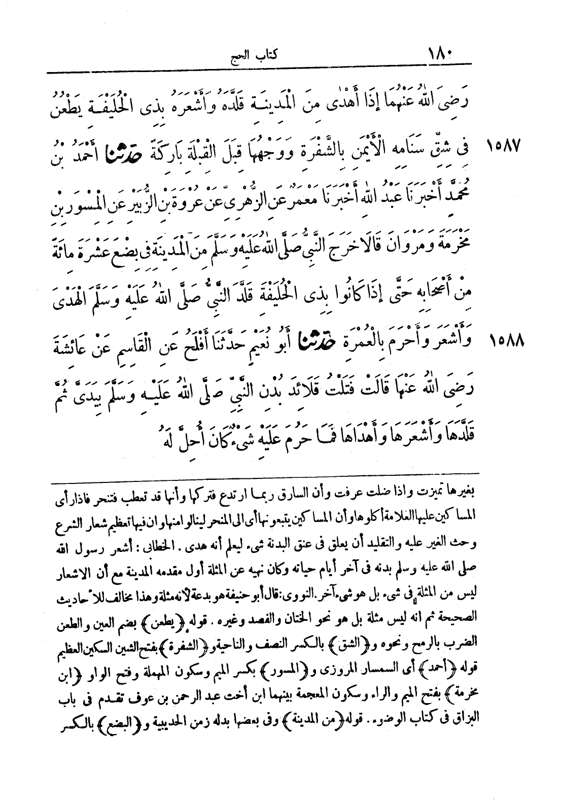 1588 - حَدَّثَنَا أَبُو نُعَيْمٍ حَدَّثَنَا أَفْلَحُ عَنْ الْقَاسِمِ عَنْ عَائِشَةَ رَضِيَ اللَّهُ عَنْهَا قَالَتْ فَتَلْتُ قَلَائِدَ بُدْنِ النَّبِيِّ صَلَّى اللَّهُ عَلَيْهِ وَسَلَّمَ بِيَدَيَّ ثُمَّ قَلَّدَهَا وَأَشْعَرَهَا وَأَهْدَاهَا فَمَا حَرُمَ عَلَيْهِ شَيْءٌ كَانَ أُحِلَّ لَهُ