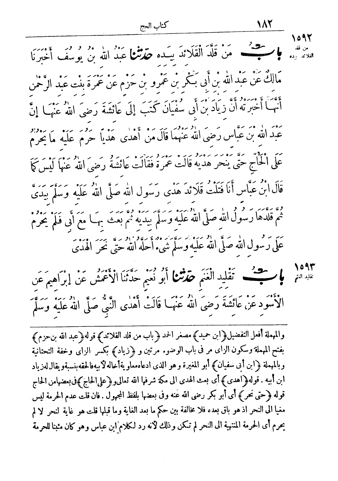 والمهملة أفعل التفضيل (ابن حميد) مصغر الحمد (باب من قلد القلائد) قوله (عبد الله بن حزم) بفتح المهملة وسكون الزاي مر في باب الوضوء مرتين و (زياد) بكسر الزاي وخفة التحتانية وبالمهملة (ابن أبي سفيان) أبو المغيرة وهو الذي ادعاه معاوية أخاله لأبيه فالحقه بنسبة ويقال له زياد ابن أبيه , قوله (اهدى) أي بعث الهدى إلى مكة شرفها الله تعالى و (على الخاج) في بعضها من الحاج قوله (حتى نحر) أي أبو بكر رضي الله عنه وفي بعضها بلفظ المجهول , فان قلت عدم الحرمة ليس مغيا إلى النحر إذ هو باق بعده فلا مخالفة بين حكم ما بعد الغاية وما قبلها قلت هو غاية لنحر لا لم يحرم أي الحرمة المنتهية إلى النحر لم تكن وذلك لانه رد لكلام ابن عباس وهو كان مثبتا للحرمة