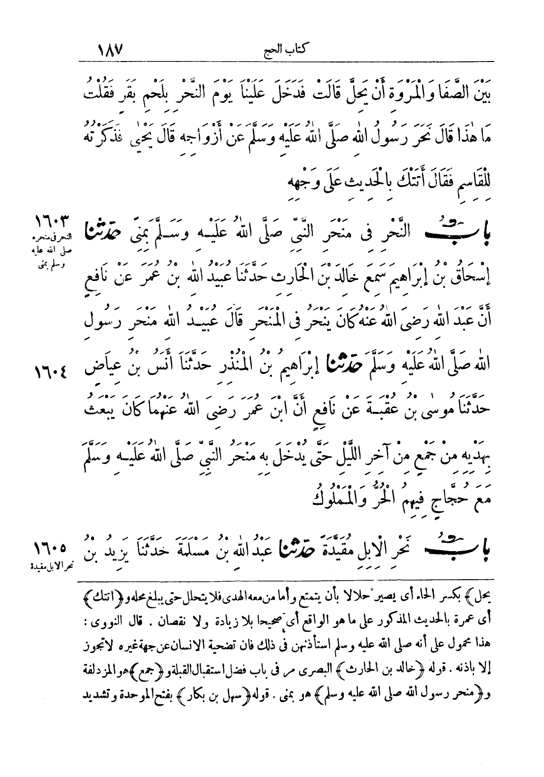 يحل) بكسر الحاء أي يصير حلالا بان يتمتع وأما من معه الهدى فلا يتحلل حتى يبلغ محله و (أتتك) أي عمرة بالحديث المذكور على ما هو الواقع أي صحيحا بال زيادة ولا نقصان , قال النووي: هذا محمول على أنه صلى الله عليه وسلم استأذنهن في ذلك فان تضحية الإنسان عن جهة غيره لا تجوز إلا بإذنه. قوله (خالد بن الحارث) البصري مر في باب فضل استقبال القبلة و (جمع) هو المزدلفة و (منحر رسول الله صلى الله عليه وسلم) هو بمنى , قوله (سهل بن بكار) بفتح الموحدة وتشديد