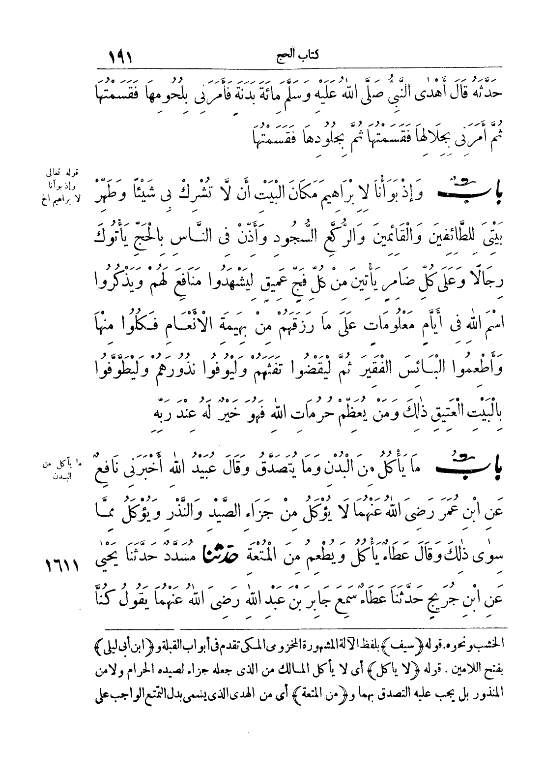 بَاب {وَإِذْ بَوَّانَا لِإِبْرَاهِيمَ مَكَانَ الْبَيْتِ أَنْ لَا تُشْرِكْ بِي شَيْئًا وَطَهِّرْ بَيْتِيَ لِلطَّائِفِينَ وَالْقَائِمِينَ وَالرُّكَّعِ السُّجُودِ وَأَذِّنْ فِي النَّاسِ بِالْحَجِّ يَاتُوكَ رِجَالًا وَعَلَى كُلِّ ضَامِرٍ يَاتِينَ مِنْ كُلِّ فَجٍّ عَمِيقٍ لِيَشْهَدُوا مَنَافِعَ لَهُمْ وَيَذْكُرُوا اسْمَ اللَّهِ فِي أَيَّامٍ مَعْلُومَاتٍ عَلَى مَا رَزَقَهُمْ مِنْ بَهِيمَةِ الْأَنْعَامِ فَكُلُوا مِنْهَا وَأَطْعِمُوا الْبَائِسَ الْفَقِيرَ ثُمَّ لْيَقْضُوا تَفَثَهُمْ وَلْيُوفُوا نُذُورَهُمْ وَلْيَطَّوَّفُوا بِالْبَيْتِ الْعَتِيقِ ذَلِكَ وَمَنْ يُعَظِّمْ حُرُمَاتِ اللَّهِ فَهُوَ خَيْرٌ لَهُ عِنْدَ رَبِّهِ}