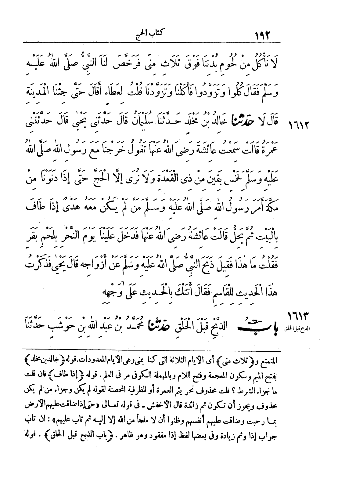 المتمتع و (ثلاث منى) أي الأيام الثلاثة التي كنا بمنى وهي الأيام المعدودات , قوله (خالد بن مخلد) بفتح الميم وسكون المعجمة وفتح اللام وبالمهملة الكوفي مر في العلم , قوله (اذا طاف) فان قلت ما جزاء الشرط؟ قلت محذوف نحو يتم العمرة أو للظرفية المحصنة لقوله لم يكن وجزاء من لم يكن محذوف ويجوز أن تكون ثم زائدة قال الأخفش-في قوله تعالى " حتى اذا ضاقت عليهم الأرض بما رحبت وضاقت عليهم أنفسهم وظنوا أن لا ملجأ من الله الا اليه ثم تاب عليهم": ان تاب جواب اذا وثم زيادة وفي بعضها لفظ اذا مفقود وهو ظاهر , (باب الذبح قبل الحلق) , قوله
