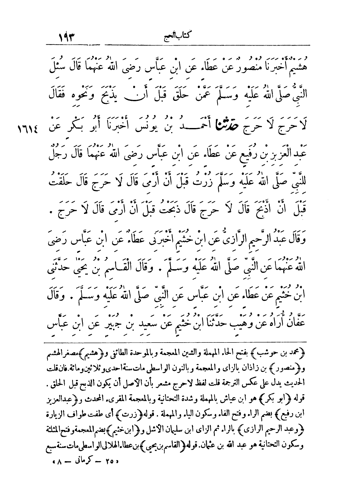 (محمد بن حوشب) بفتح الحاء المهملة والشين المعجمة وبالموحدة الطائفي و (هشيم) مصغر الهشم و (منصور) بن زاذان بالزاي والمعجمة وبالنون الواسطي مات سنة احدى وثلاثين ومائة. فان قلت الحديث يدل على عكس الترجمة قلت لفظ لا حرج مشعر بأن الاصل أن يكون الذبح قبل الحلق, قوله (أبو بكر) هو ابن عياش بالمهملة وشدة التحتانية وبالمعجمة المقريء المحدث و (عبد العزيز ابن رفيع) بضم الراء وفتح الفاء وسكون الياء والمهملة , قوله (زرت) أي طفت طواف الزيارة (وعبد الرحيم الرازي) بالراء ثم الزاي ابن سليمان الأشل و (ابن خثيم) بضم المعجمة وفتح المثلثة وسكون التحتانية هو عبد الله بن عثمان , قوله (القاسم بن يحي) بن عطاء الهلالي الواسطي مات سنة سبع
