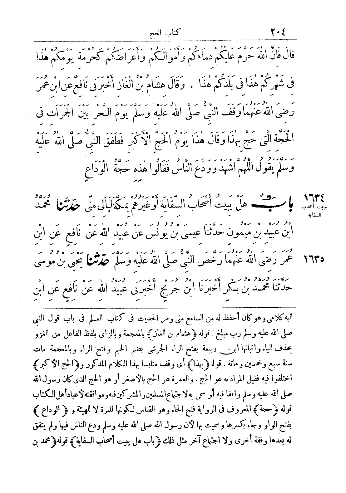 إليه كلامي وهو كان أحفظ له من السامع منى ومر الحديث في كتاب العلم في باب قول النبي صلى الله عليه وسلم رب مبلغ. قوله (هشام بن الغاز) بالمعجمة وبالزاي بلفظ الفاعل من الغزو بحذف الياء واثباتها ابن ربيعة بفتح الراء الجرشى بضم الجيم وفتح الراء وبالمعجمة مات سنة سبع وخمسين ومائة. قوله (بهذا) أي وقف متلبسا بهذا الكلام المذكور و (الحج الأكبر) اختلفوا فيه فقيل المراد به هو الحج. والعمرة هو الحج الأصغر أو هو الحج الذي كان رسول الله صلى الله عليه وسلم واقفا فيه أو سمي به لاجتماع المسلمين والمشركين فيه وموافقته لأعياد أهل الكتاب قوله (حجة) المعروف في الرواية فتح الحاء وهو القياس لكونها للمرة لا للهيئة و (الوداع) بفتح الواو وجاء بكسرها وسميت بها لأن رسول الله صلى الله عليه وسلم ودع الناس فيها ولم يتفق له بعدها وقفة أخرى ولا اجتماع آخر مثل ذلك (باب هل ببيت أصحاب السقاية) قوله (محمد بن
